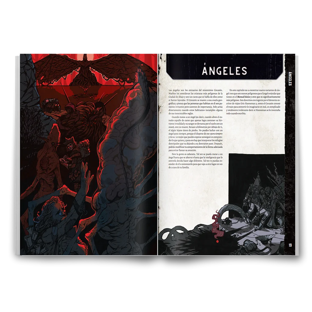 Por último, encontrarás las reglas para cuatro nuevos tipos de ángeles, los mensajeros del Mismísimo Corazón, que se infiltran y destrozan los refugios. También disfrutarás del personaje de Gris Hannemann, un escritor de novelas pulp que, según parece, se inventó a los ángeles para vender más ejemplares de sus libros. Pero ahora son reales.