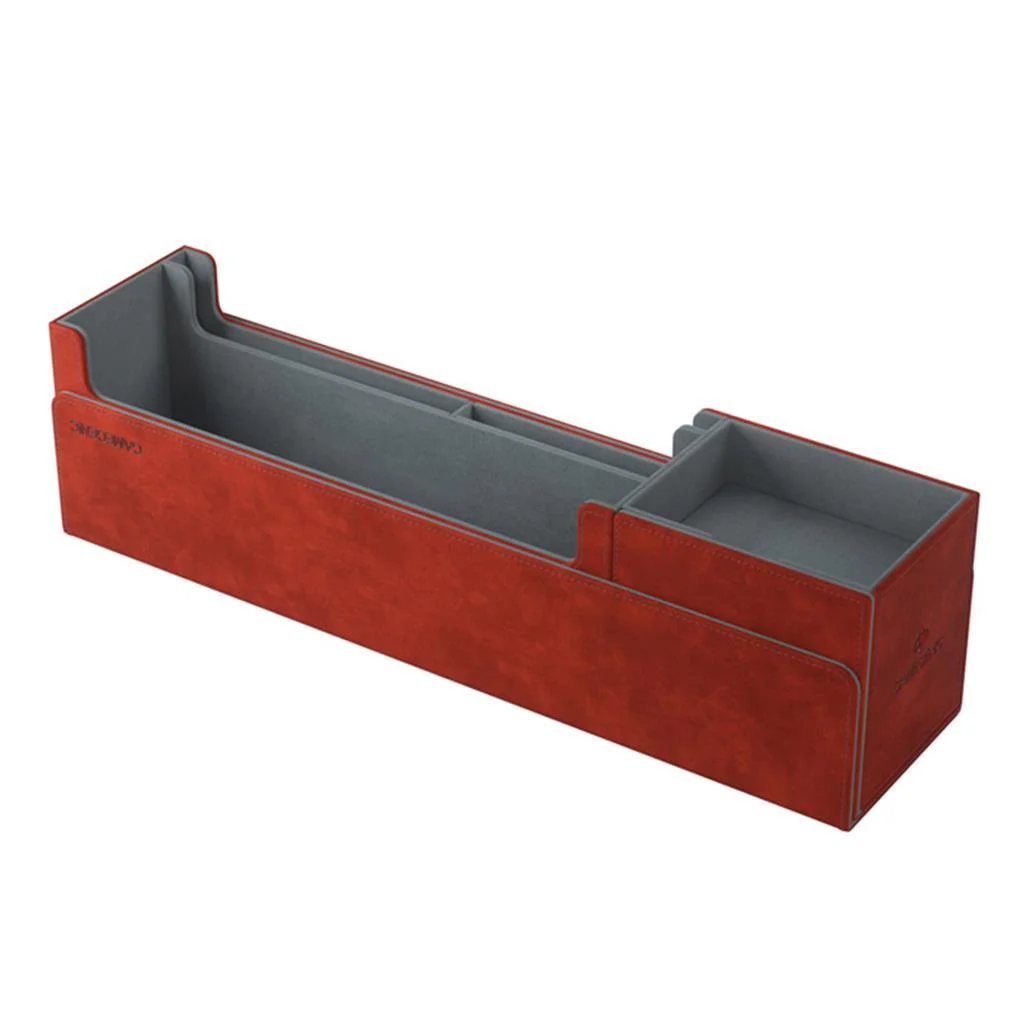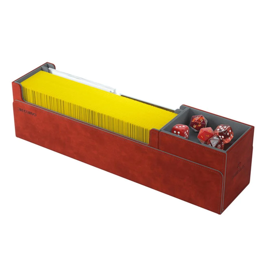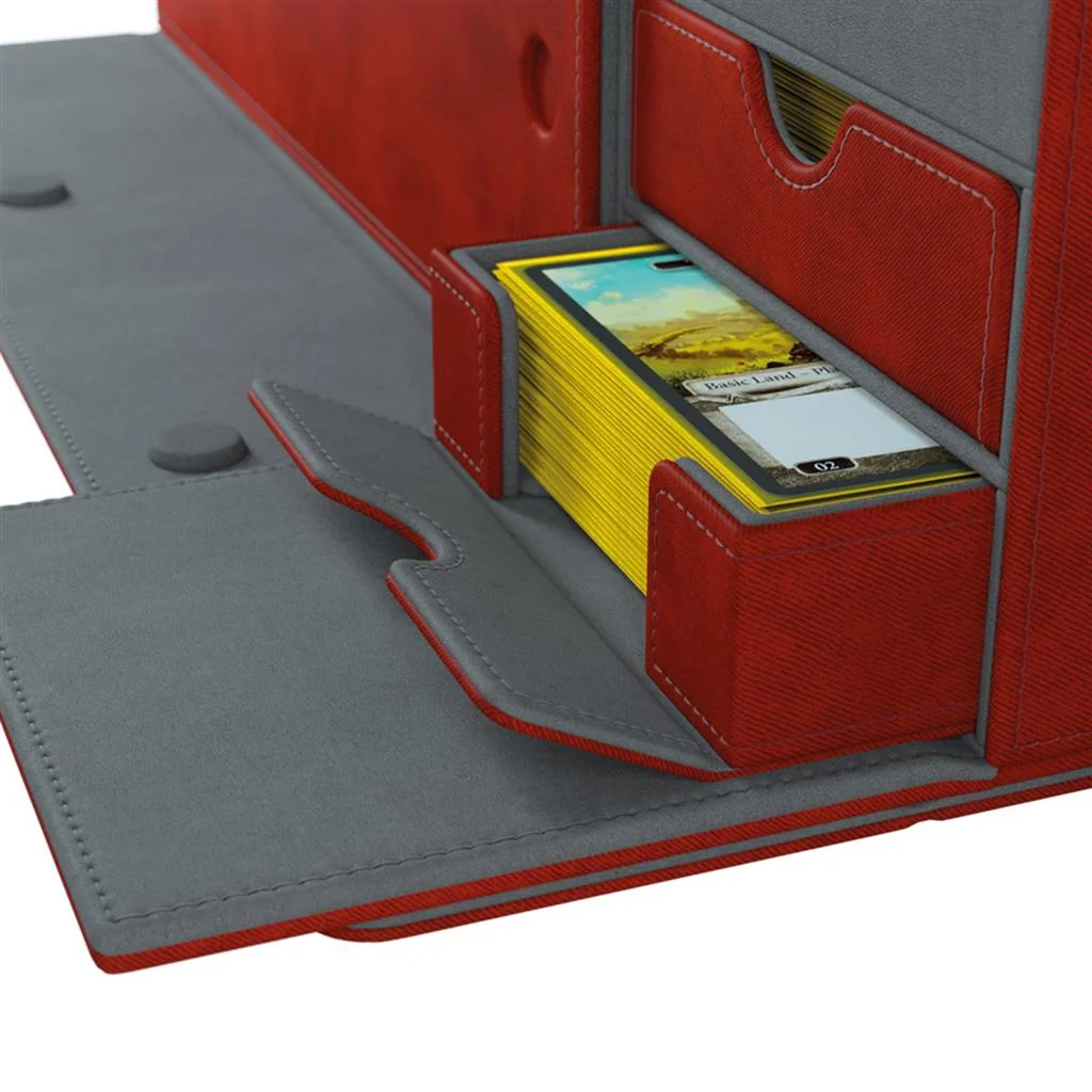 Esta caja multifuncional de calidad está diseñada para almacenar 400 cartas con doble funda o 540 cartas de juegos de mesa con fundas*. Sus 2 cajones extraíbles con solapas magnéticas revolucionarias te permiten acceder con facilidad a las fichas, las cartas con fundas o a los mazos completos. El compartimento superior está diseñado para almacenar cualquier accesorio adicional, cartas que ya se hayan jugado o para usarse como bandeja para dados pequeña.
