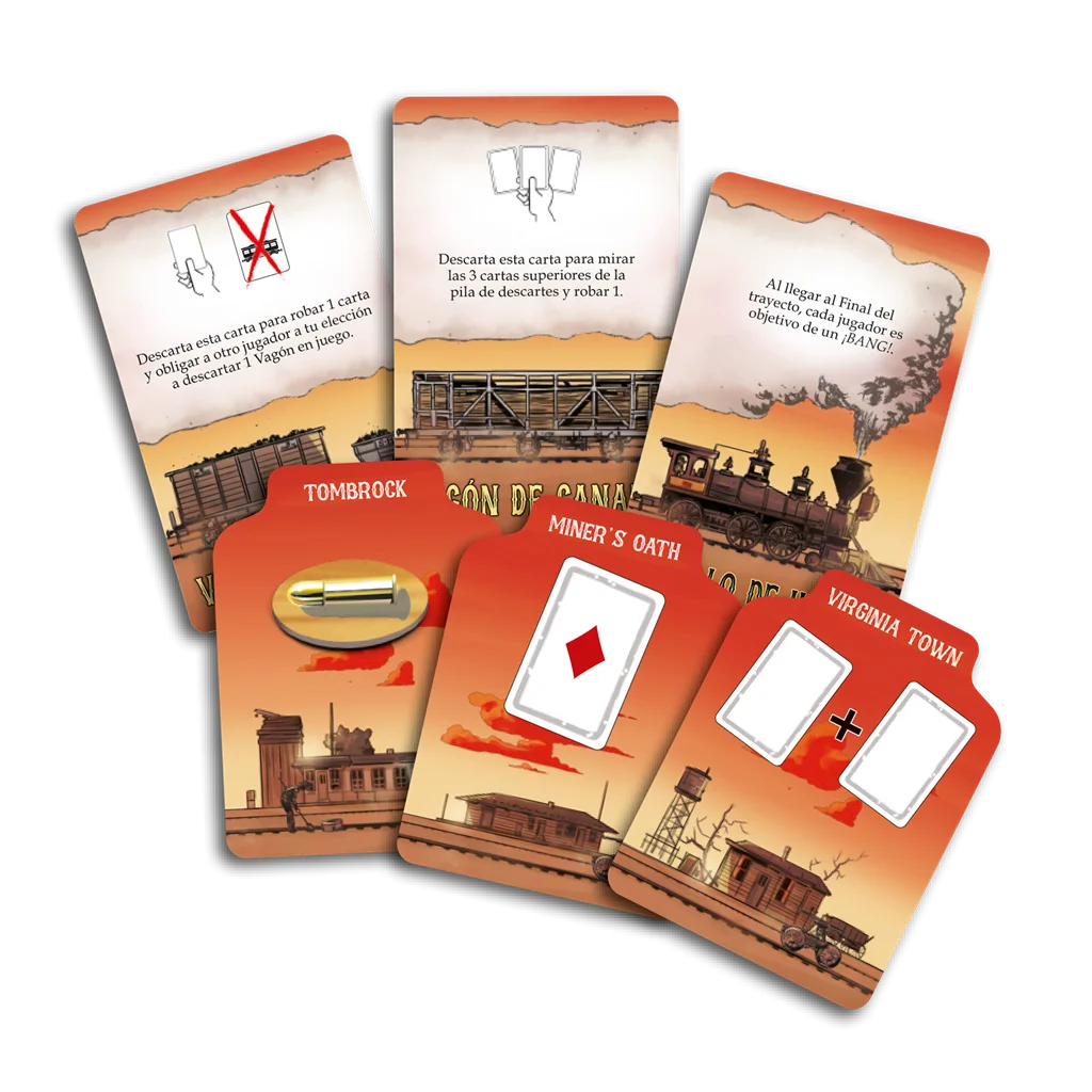 ¿Saquearás el tren con tu banda o lo defenderás a toda costa? ¡Todos a bordo! CONTENIDO 16 cartas de Vagón, 1 carta de Locomotora, 14 piezas de Estación, 8 cartas de Personaje, 16 cartas de juego, reglamento. NOTA ¡Ojo! Esta expansión no es un juego completo. ¡Necesitas el exitoso juego Bang! para jugar! Subir