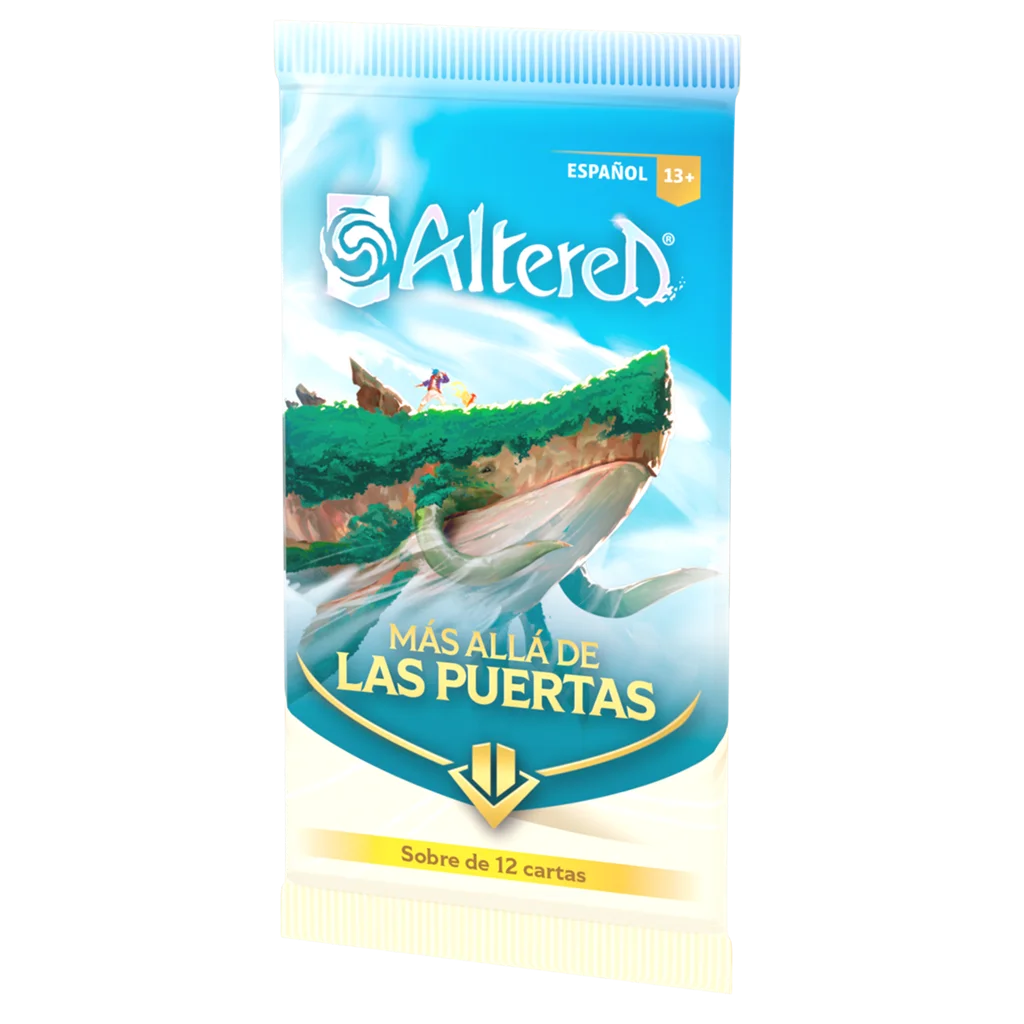Cada sobre de Altered: Más allá de las puertas contiene 12 cartas (1 carta de héroe, 8 cartas comunes y 3 cartas raras)