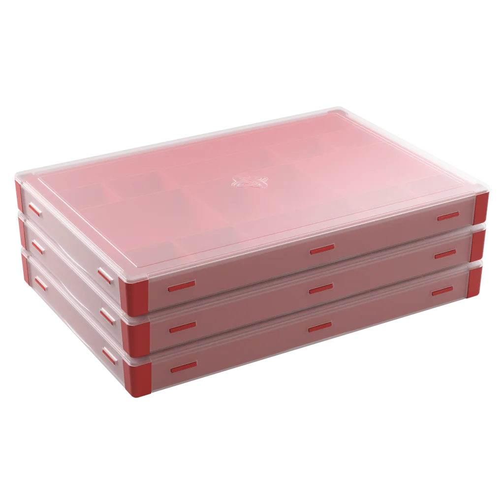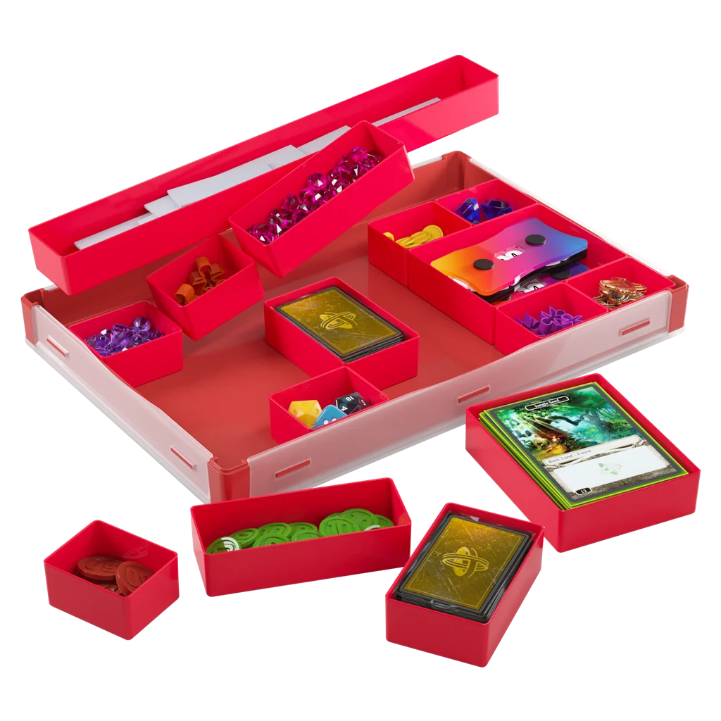Este complemento Gamegenic es perfecto para almacenar y organizar fichas, cartas, diales, dados y muchos otros accesorios. Tiene 15 bandejas de tamaños diferentes entre las que se incluyen 2 bandejas para cartas de tamaño americano mini, 2 para cartas de tamaño estándar y 1 bandeja extralarga. Todas estas bandejas son extraíbes y se pueden intercambiar por bandejas del modelo original Token Silo y del modelo Token Silo Cards Add-on, de manera que podrás personalizar la caja a tu antojo. Su tapa completamente extraíble permite acceder fácilmente a todos los componentes y ahorra espacio en la mesa de juego.