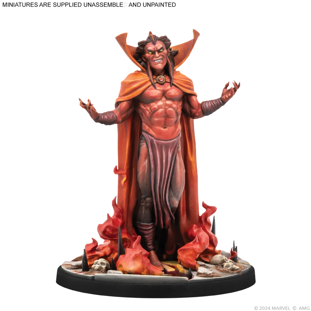 1 miniatura de Mefisto, 1 base, 1 carta de personaje, 1 carta de atributos, 4 cartas de Tácticas de equipo, 1 hoja de fichas, 1 encarte