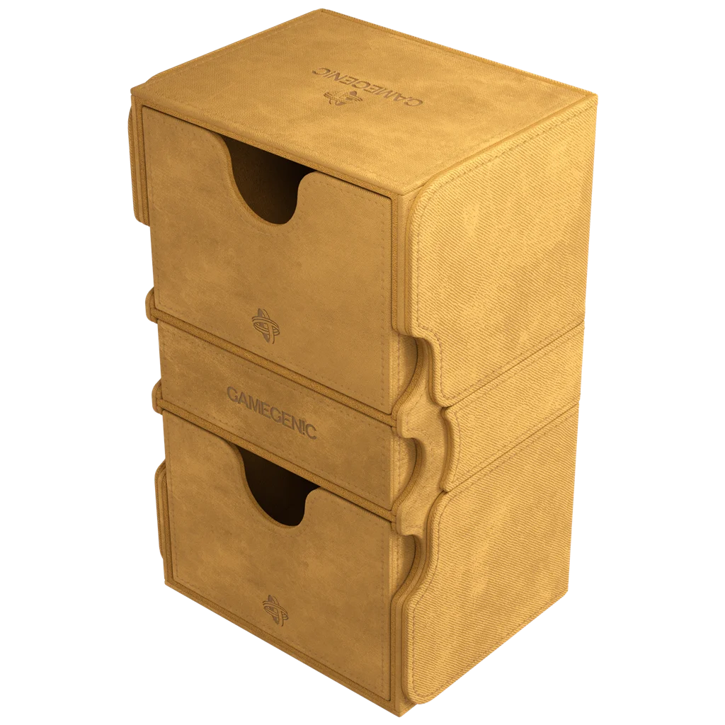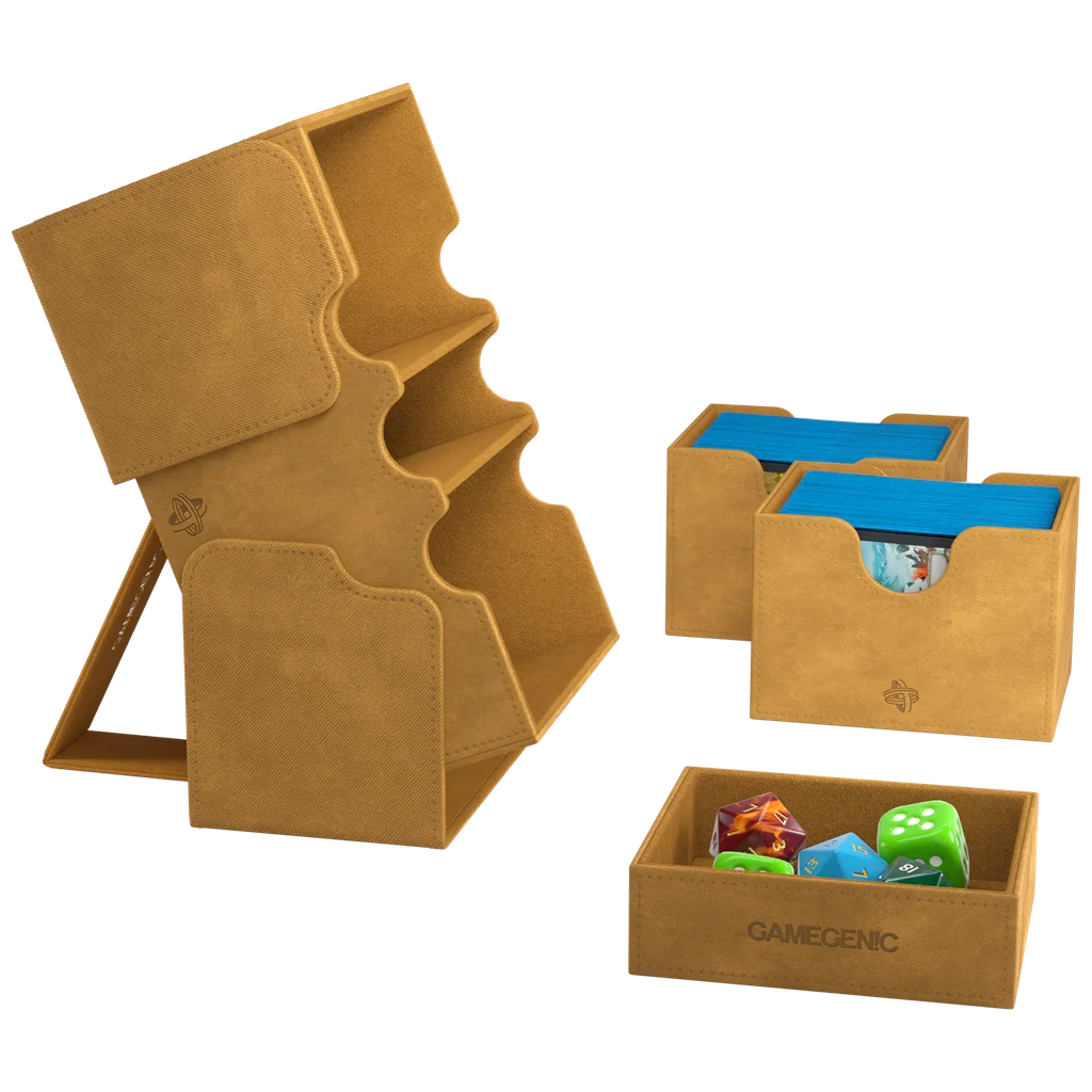 Hemos creado esta versión exclusiva de la caja Stronghold 200+ para poder guardar 200 cartas estándar en doble funda* y que, además, tiene espacio adicional para fichas o para 2 mazos Commander** con fundas interiores más gruesas. Además, el cajón para accesorios es perfecto para guardar dados, otros objetos pequeños e incluso más cartas con fundas.