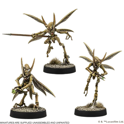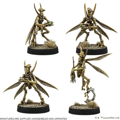 Cuando se ven superados en armamento, los geonosianos recurren a su ingente número para abrumar a sus enemigos en el campo de batalla. Se incluyen suficientes miniaturas para desplegar 1 unidad de Tropa.