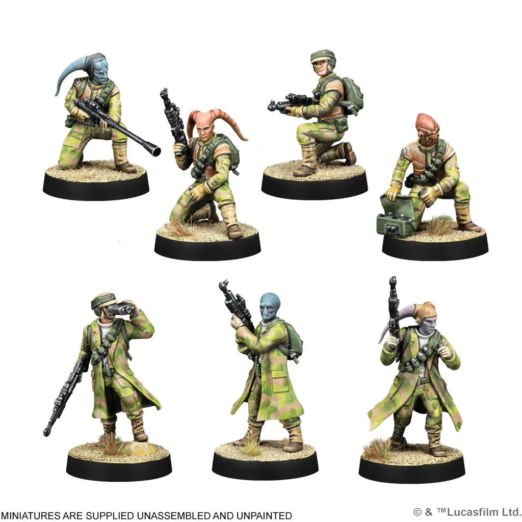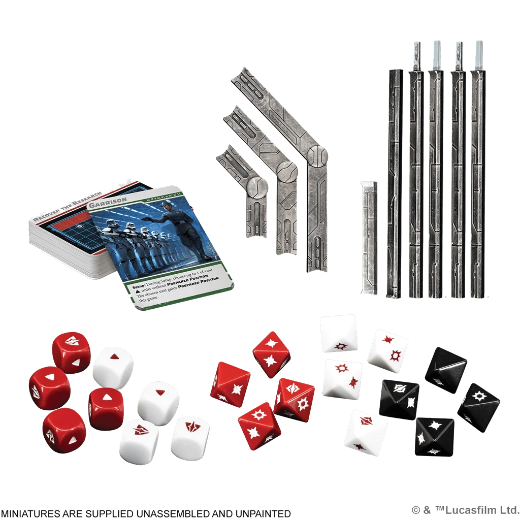 36 miniaturas, 7 cartas de Unidad, 16 cartas de Mejora, 10 cartas de Mando, 24 cartas de Batalla, 4 dados rojos de ataque, 4 dados negros de ataque, 4 dados blancos de ataque, 4 dados rojos de defensa, 4 dados blancos de defensa, 3 láminas de fichas, 1 juego de plantillas de movimiento (larga, mediana y corta), 1 juego de reglas de alcance (½ y 1, en 5 segmentos), 3 hojas de información