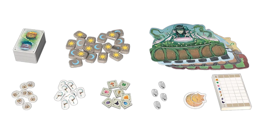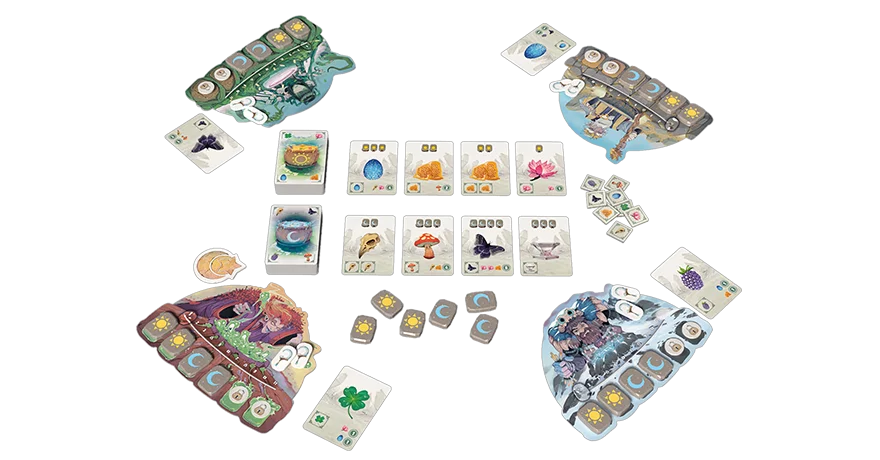 También puedes tomar runas para rellenar los espacios vacíos de tu tablero con runas de la reserva, eligiendo entre Lunas o Soles, pero nunca combinando ambos tipos en la misma acción. Por último, puedes voltear runas, girando las de tu tablero para asegurarte de que todas las bocarriba sean del mismo tipo: Lunas o Soles. Estas acciones estratégicas son esenciales para acumular los ingredientes necesarios y maximizar la puntuación en la competición druídica.