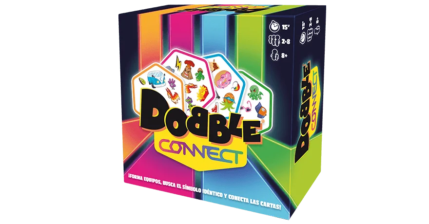 En Dobble Connect tendrás que nombrar lo más deprisa posible el símbolo que tiene en común con alguna de las cartas ya colocadas. Conecta 4 cartas de tu color para ganar la ronda y gana varias rondas para ganar la partida. Además, todos los equipos juegan a la vez, así que tendrás que darte prisa y no perder de vista a los demás equipos para bloquearlos con tus cartas antes de que ellos hagan lo mismo contigo.
