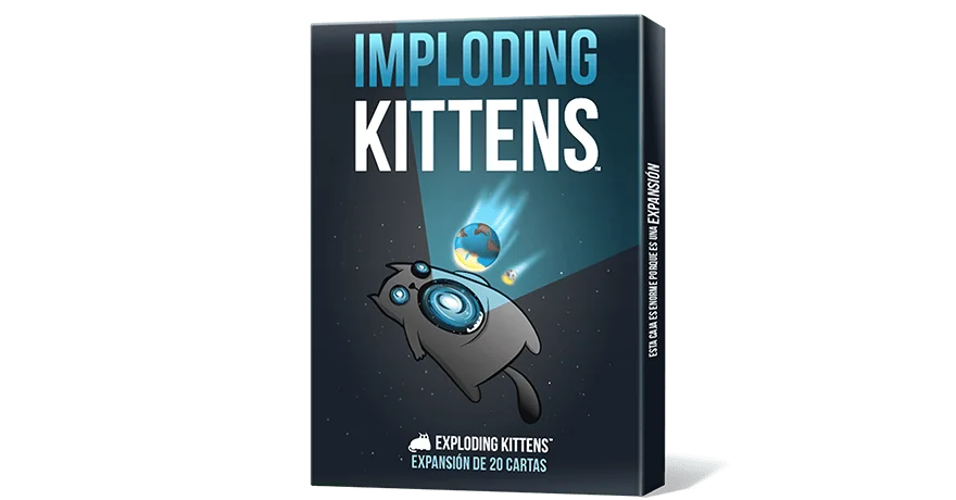 Imploding Kittens es la primera expansión de Exploding Kittens y añade 20 cartas nuevas, la posibilidad de sumar un sexto jugador y un cono de la vergüenza.