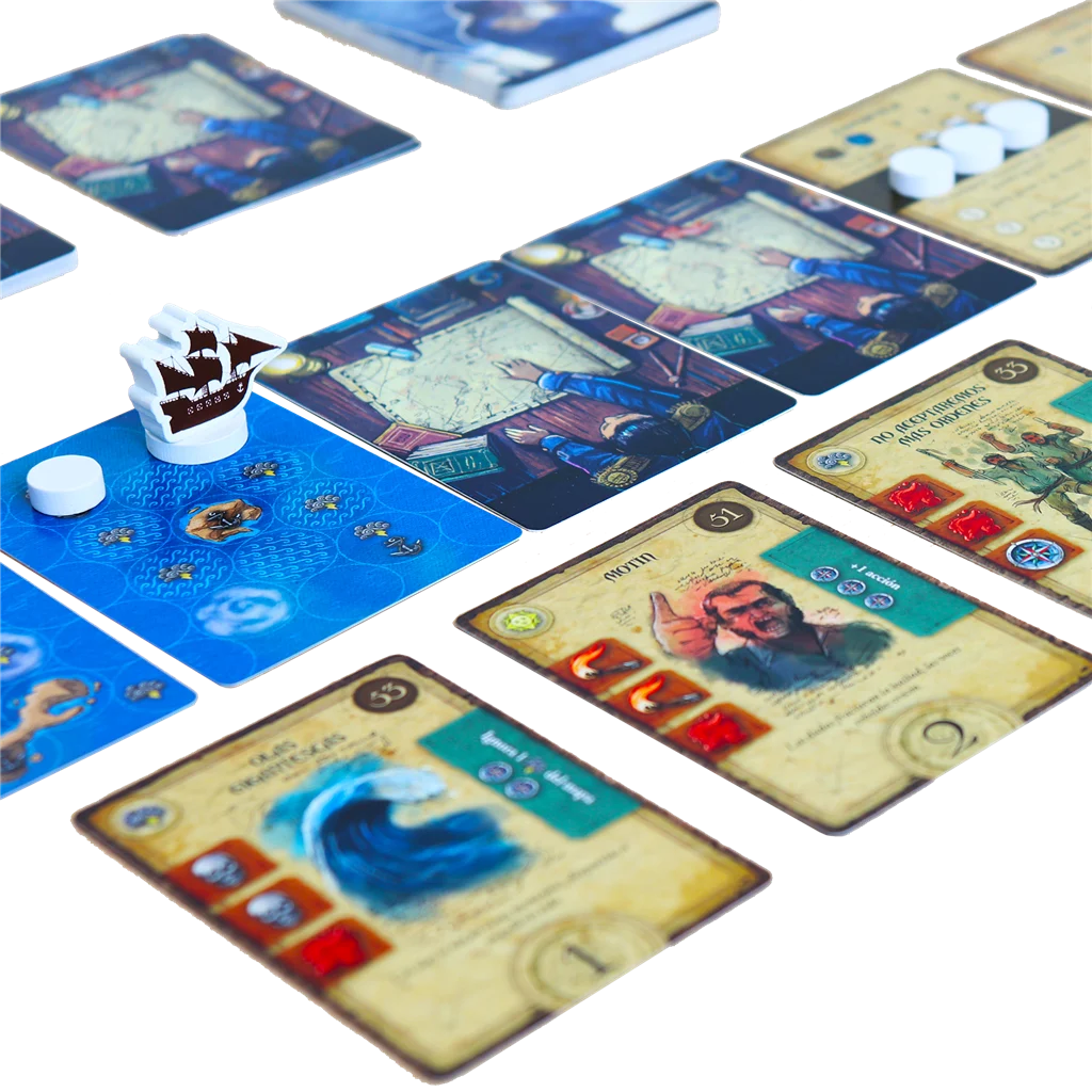Adamastor es un juego solitario de gestión de cartas multiuso donde deberás buscar el equilibrio para que los contratiempos en forma de enfermedades, motines, escasez y traumas no pesen más que la esperanza y la sed de aventuras, consiguiendo así llevar tu embarcación hasta su destino final.