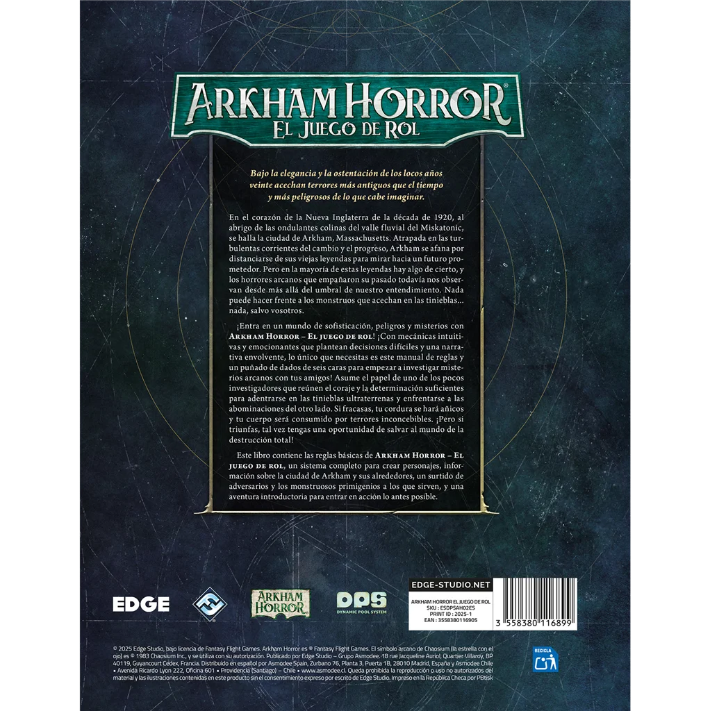 Este libro contiene las reglas básicas de ARKHAM HORROR – EL JUEGO DE ROL, un sistema completo para crear personajes, información sobre la ciudad de Arkham y sus alrededores, un surtido de adversarios y los monstruosos primigenios a los que sirven, y una aventura introductoria para entrar en acción lo antes posible.