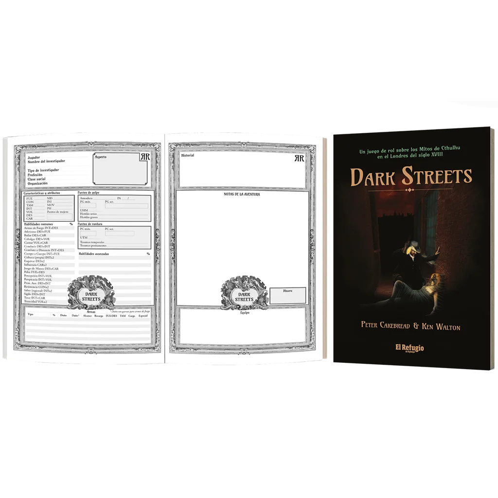 Dark Streets incluye todo lo que necesitas para jugar. Utiliza Renaissance Deluxe: un sistema d100 simplificado que se basa en OpenQuest. Será, por tanto, familiar para cualquiera que haya jugado a La llamada de Cthulhu.
