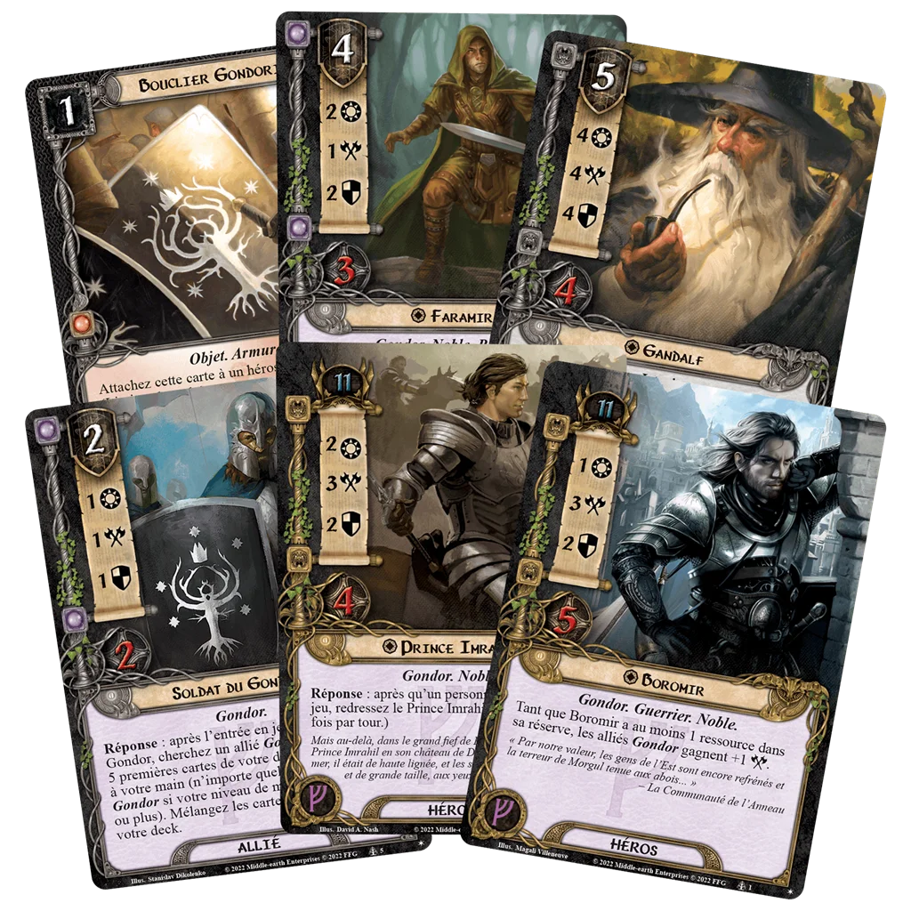 •  Cartas adicionales con la temática de Gondor que pueden utilizarse para mejorar y personalizar cualquier mazo.