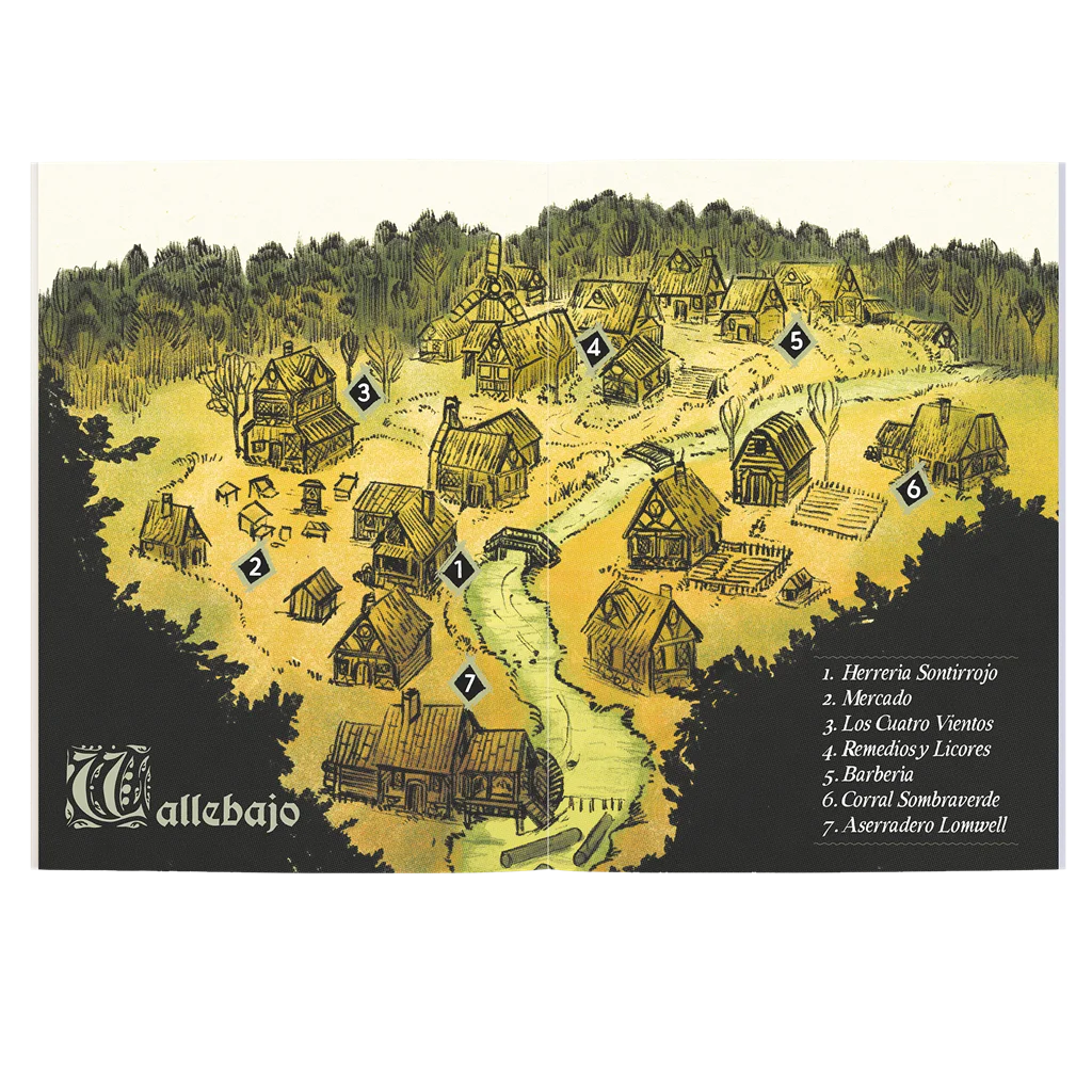 La primera mitad te lleva a conocer la historia de Vallebajo y sus gentes, así como los misterios que rodean este lugar. En las páginas centrales se explica todo lo relativo a la Bestia Blanca. Por último, en la segunda mitad, encontraréis el contenido más OSR, dividido en áreas fijas, áreas aleatorias y encuentros, se explican con detalle los diferentes lugares, personajes, criaturas y eventos que los aventureros encontrarán una vez se adentren en el Bosque.