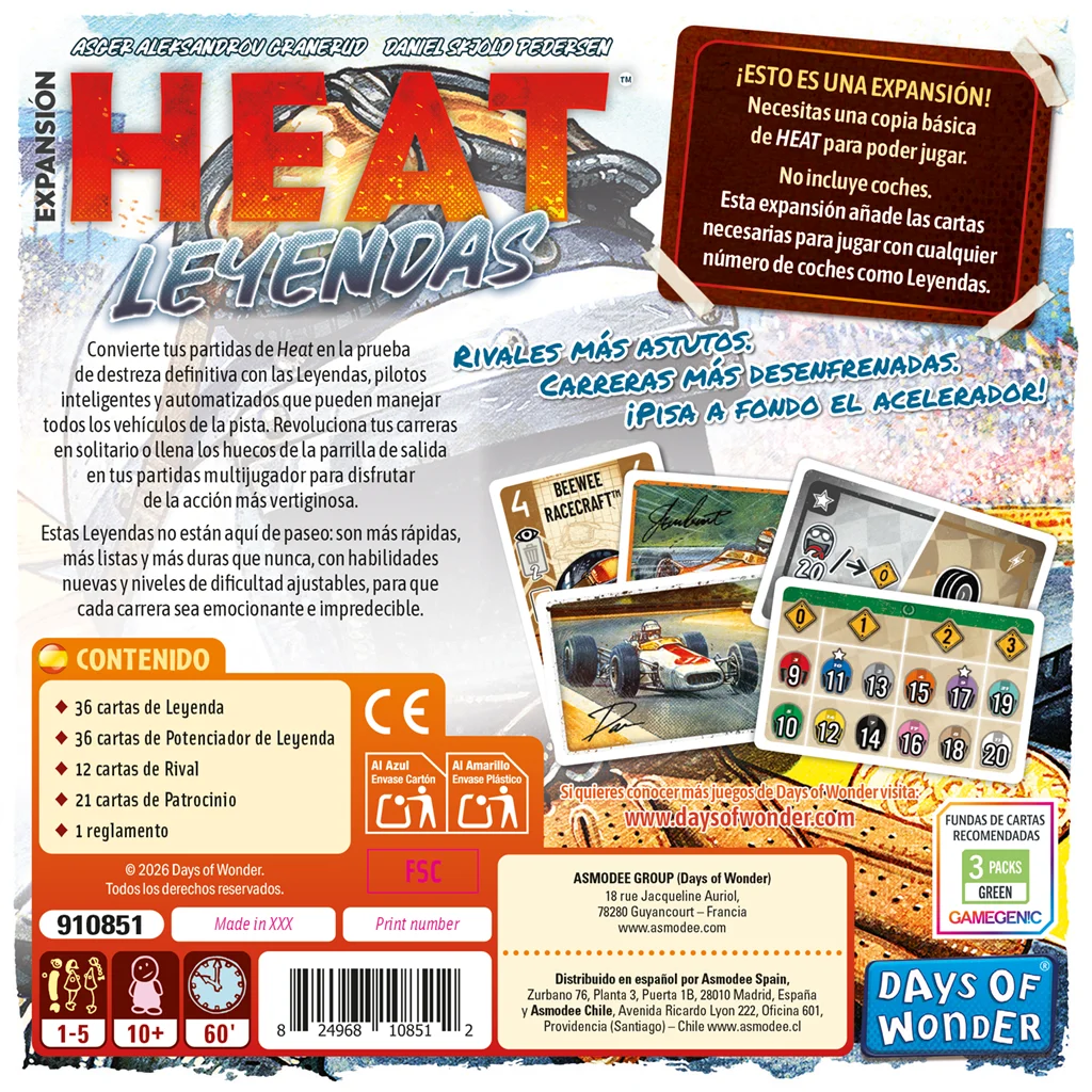 ¡ESTO ES UNA EXPANSIÓN! Necesitas una copia básica de Heat para poder jugar. No incluye coches. Esta expansión añade las cartas necesarias para jugar con cualquier número de coches como Leyendas.