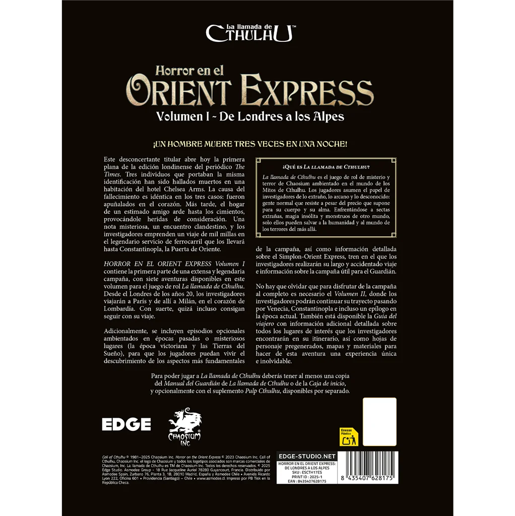 HORROR EN EL ORIENT EXPRESS Volumen I contiene la primera parte de una extensa y legendaria campaña, con siete aventuras disponibles en este volumen para el juego de rol La llamada de Cthulhu. Desde el Londres de los años 20, los investigadores viajarán a París y de allí a Milán, en el corazón de Lombardía. Con suerte, quizá incluso consigan seguir con su viaje.