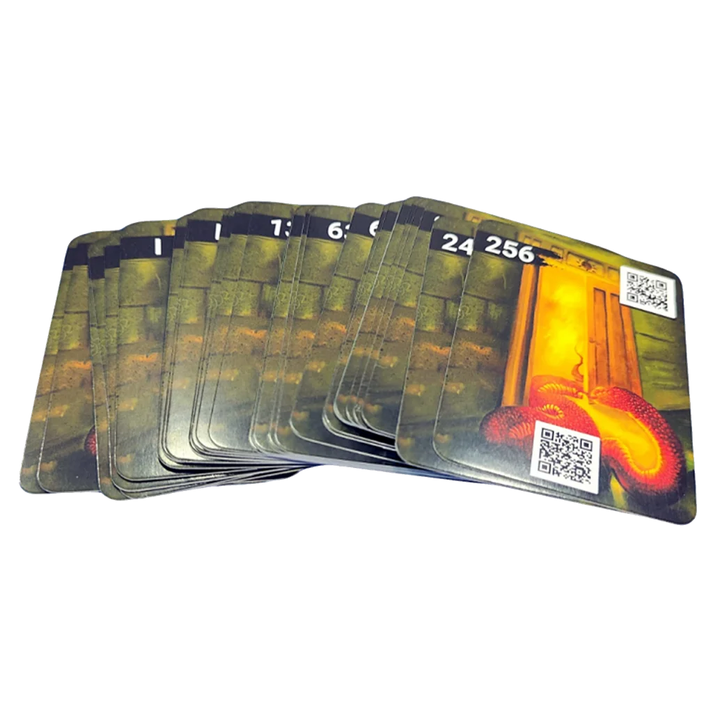 94 Cartas de juego, 1 Carta de códigos, 1 Carta de resumen de reglas, 1 Reglamento