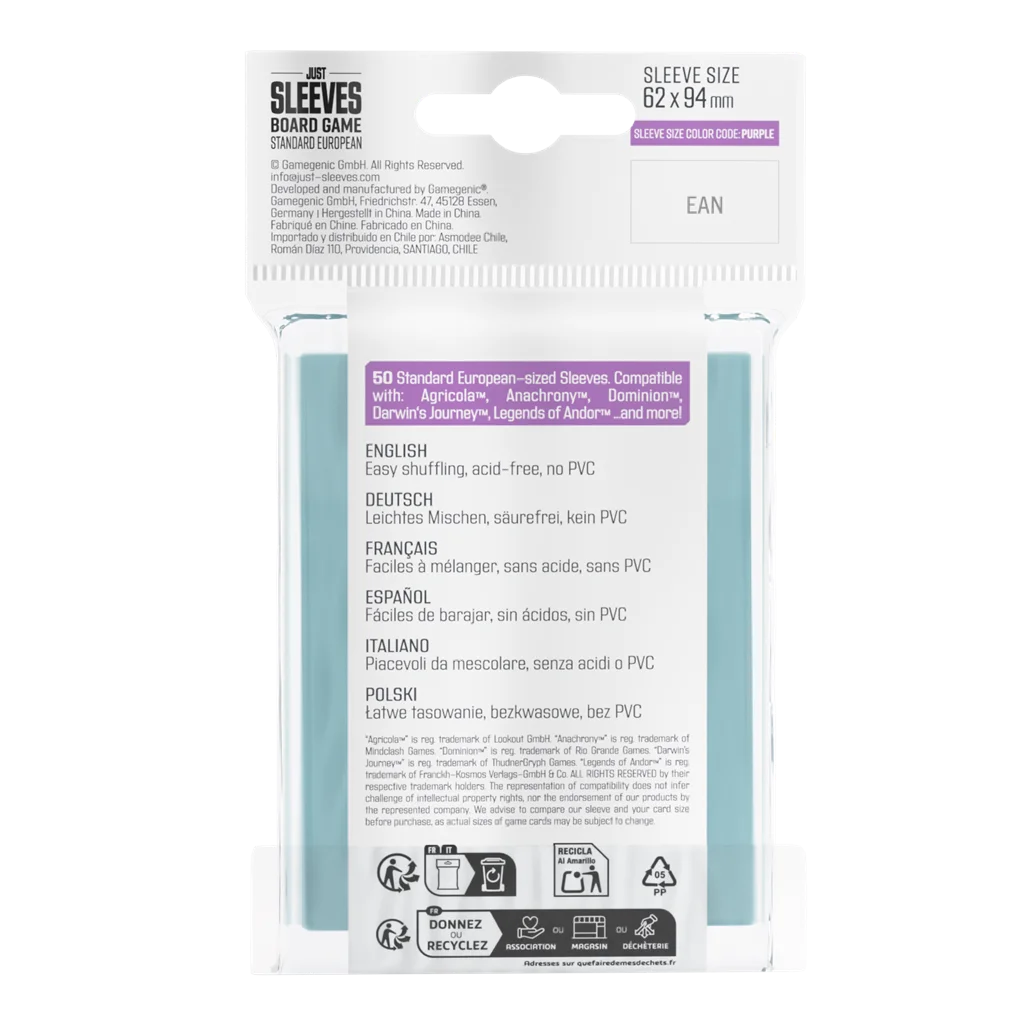 50 Standard European-sized Sleeves.Compatible with: Agricola™, Anachrony™, Dominion™, Darwin's Journey ™, Legends of Andor™ ...…