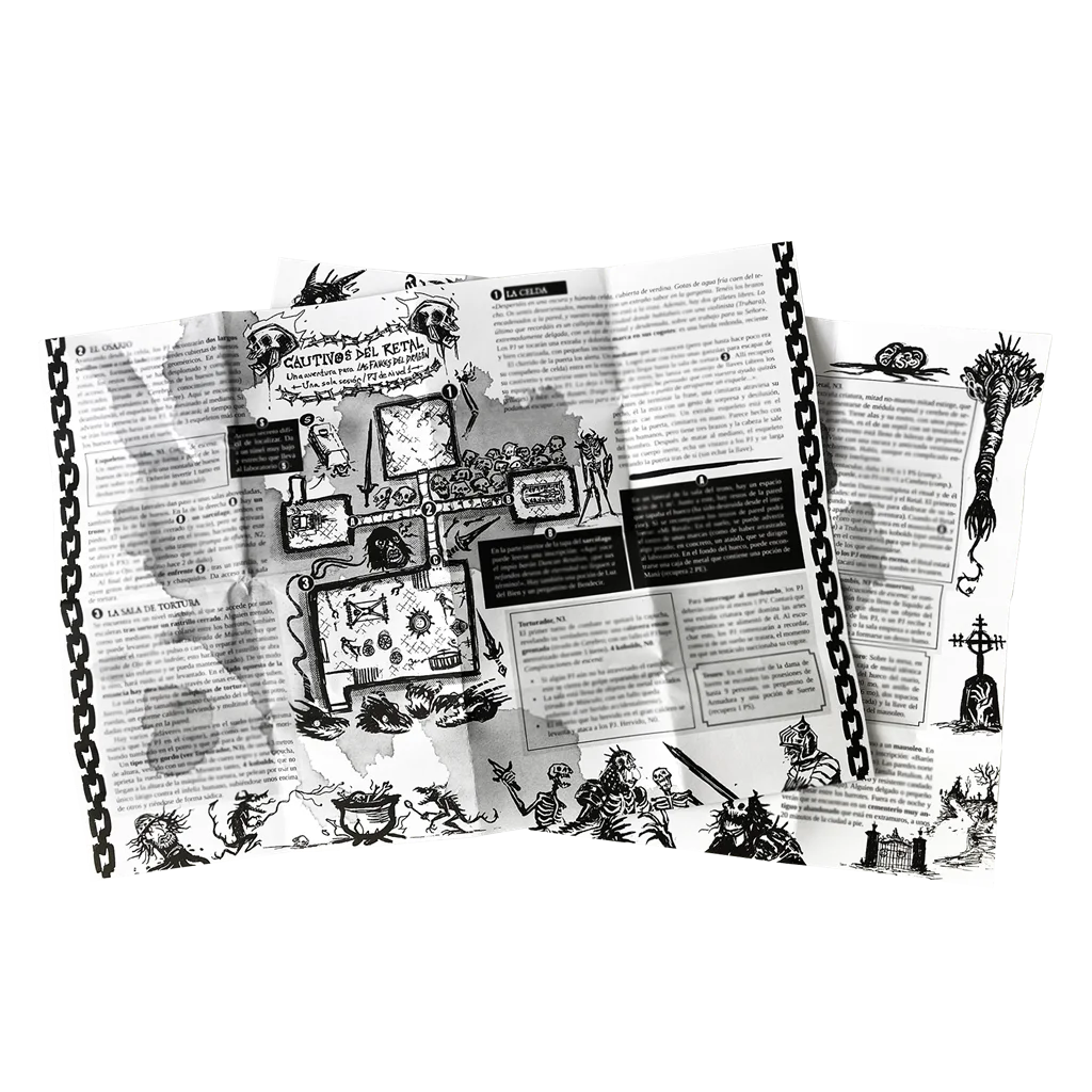 2 mapas en formato A3 con la aventura Cautivos del Retal para PJ de nivel 1. Una aventura completa, ilustrada por Tania Herrero, que incluye el mapa de una mazmorra, descripciones detalladas, enemigos, tesoros y recompensas. «Despertáis en una oscura y húmeda celda, cubierta de verdina. Gotas de agua fría caen del te-cho. Os sentís desorientados, mareados y con un extraño sabor en la garganta. Tenéis los brazos encadenados a la pared, y vuestro equipo no está a la vista. Lo último que recordáis es...».