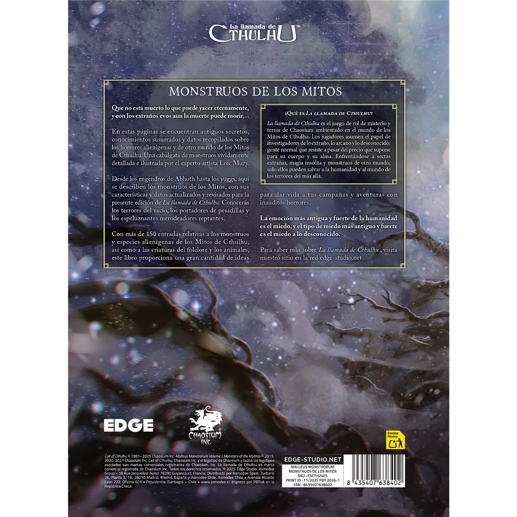 Desde los engendros de Abhoth hasta los yuggs, aquí se describen los monstruos de los Mitos, con sus características y datos actualizados y revisados para la presente edición de La llamada de Cthulhu. Conocerás los terrores del vacío, los portadores de pesadillas y los espeluznantes merodeadores reptantes.
