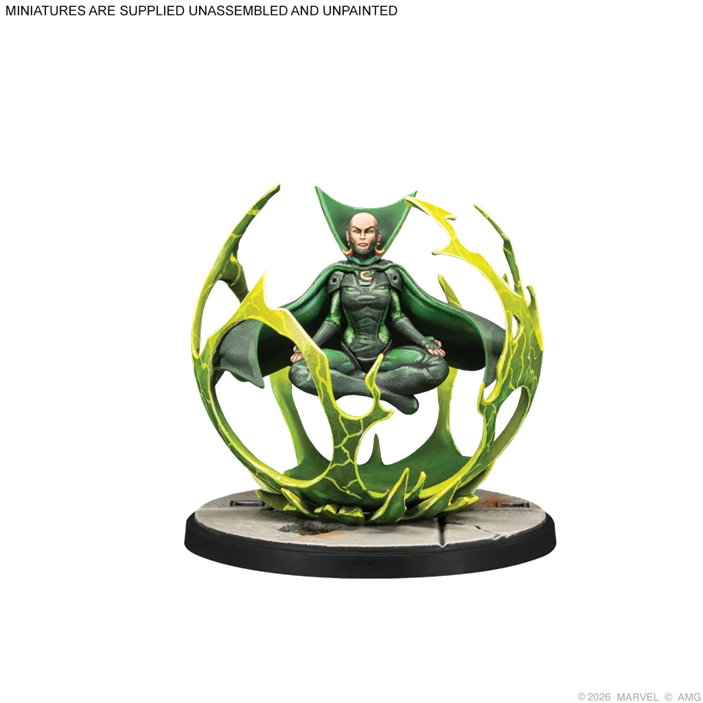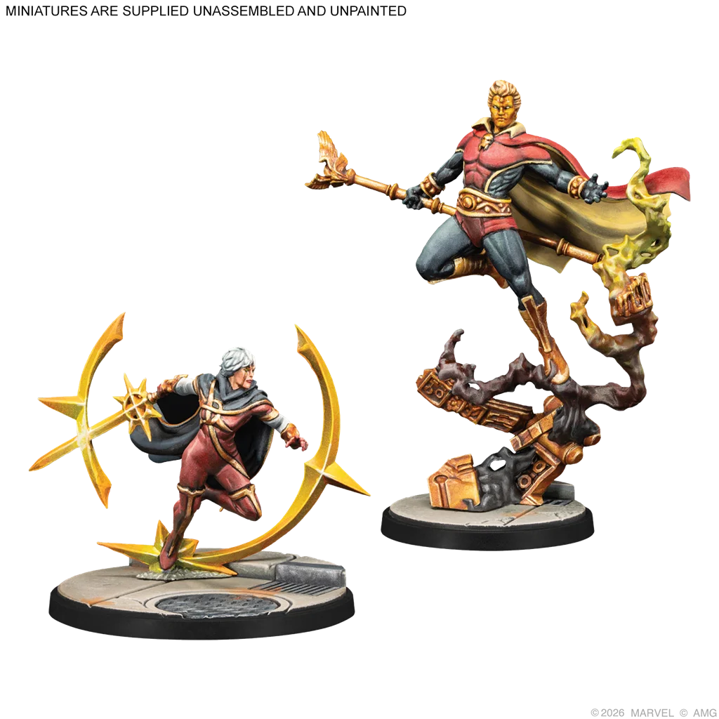 1 miniatura de Adam Warlock, 1 miniatura de Dragón Lunar, 1 miniatura de Quasar, 3 peanas, 3 cartas de atributos de Personaje, 4 cartas de Tácticas de equipo, 6 cartas de Gema del Infinito, 1 hoja de fichas