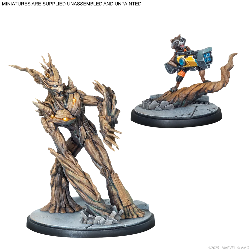 1 miniatura de Groot, 1 miniatura de Mapache Cohete, 1 miniatura de Starlord, 1 miniatura de Motorista Fantasma Cósmico, 4 peanas, 4 cartas de atributos de Personaje, 5 cartas de Tácticas de equipo, 1 carta de Gema del Infinito, 1 hoja de fichas, 1 encarte