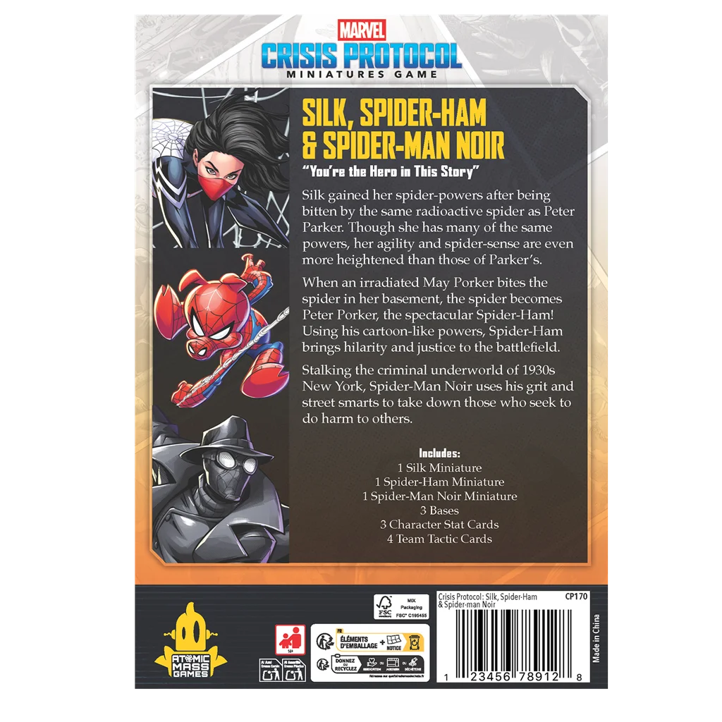 1 miniatura de Seda, 1 miniatura de Spiderham, 1 miniatura de Spiderman Noir, 3 peanas, 3 cartas de atributos de Personaje, 4 cartas de Tácticas de equipo, 1 hoja de fichas
