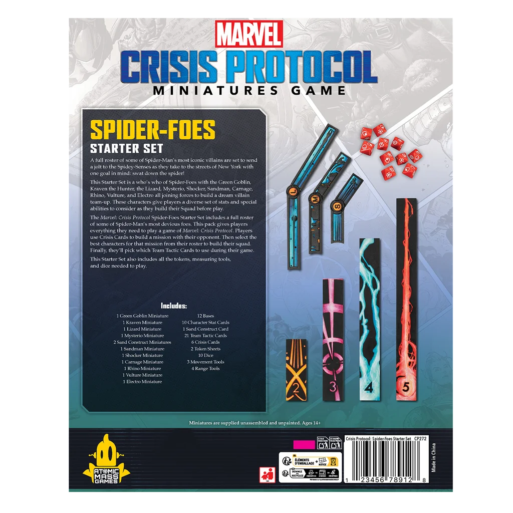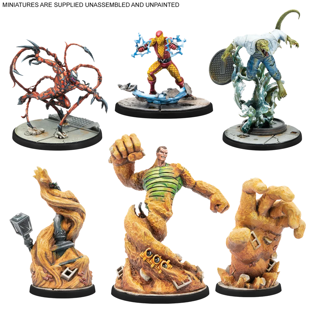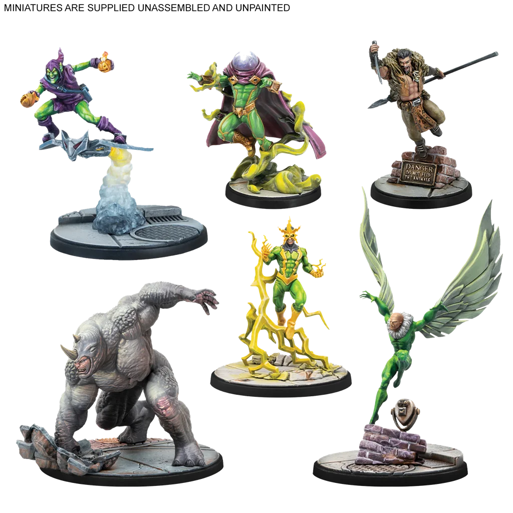 Esta Caja de Inicio se nutre de la élite de los Enemigos de Spiderman, ya que incluye al Duende Verde, Kraven el Cazador, el Lagarto, Mysterio, Conmocionador, el Hombre de Arena, Matanza, Rino, el Buitre y Electro, todos aunando fuerzas para crear un equipo de villanos de ensueño. Estos Personajes ofrecen a los jugadores una gran variedad de atributos y capacidades especiales a tener en cuenta al crear su Escuadra antes de jugar.