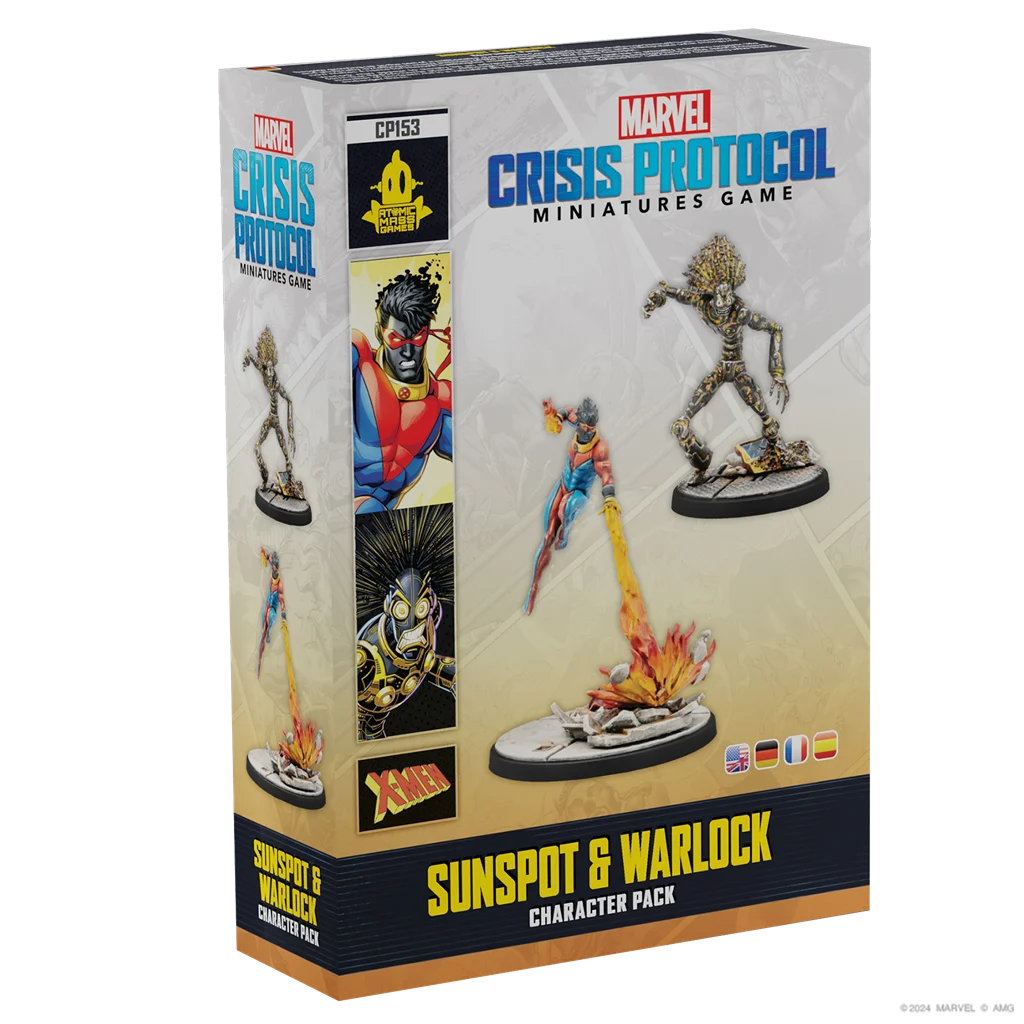 1 miniatura de Mancha Solar, 1 miniatura de Warlock, 2 peanas, 2 cartas de atributos de Personaje, 5 cartas de Tácticas de equipo, 1 hoja de fichas