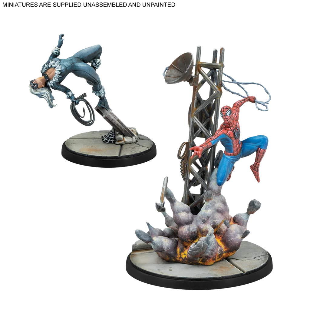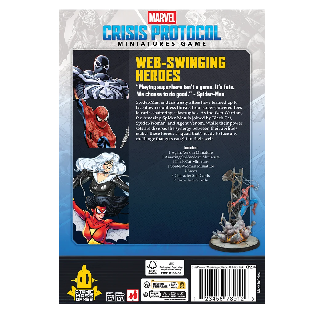 1 miniatura de Agente Venom, 1 miniatura de El Asombroso Spiderman, 1 miniatura de Gata Negra, 1 miniatura de Spiderwoman, 4 peanas, 4 cartas de atributos de Personaje, 7 cartas de Tácticas de equipo