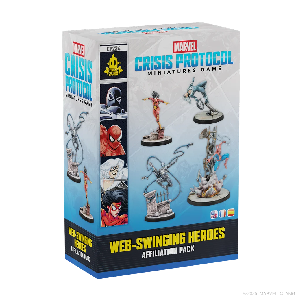 1 miniatura de Agente Venom, 1 miniatura de El Asombroso Spiderman, 1 miniatura de Gata Negra, 1 miniatura de Spiderwoman, 4 peanas, 4 cartas de atributos de Personaje, 7 cartas de Tácticas de equipo