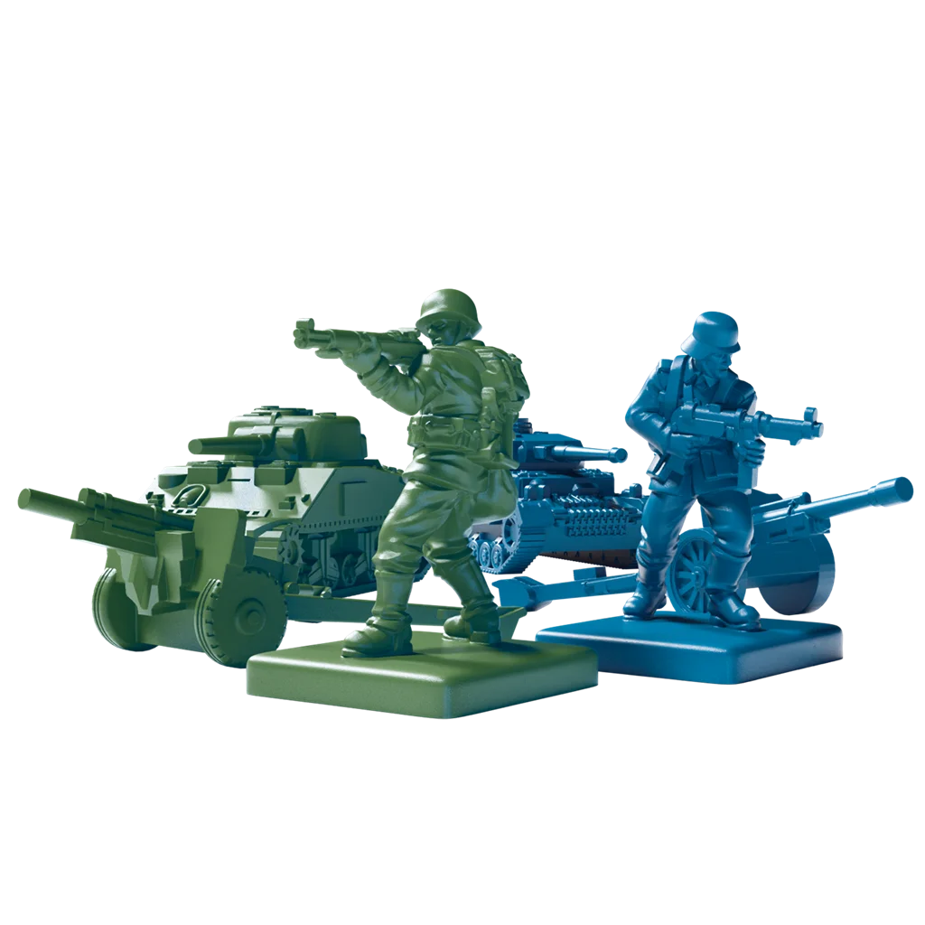 1 tablero de doble cara, 144 miniaturas de ejército (Eje y Aliados), 36 obstáculos, 44 hexágonos de Terreno de