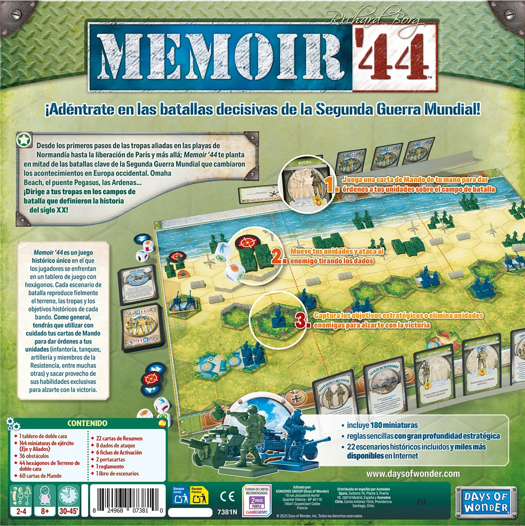 Memoir ’44 es un juego histórico único en el que los jugadores se enfrentan en un tablero de juego con hexágonos. Cada escenario de batalla reproduce fielmente el terreno, las tropas y los objetivos históricos de cada bando. Como general, tendrás que utilizar con cuidado tus cartas de Mando para dar órdenes a tus unidades (infantería, tanques, artillería y miembros de la Resistencia, entre muchas otras) y sacar provecho de sus habilidades exclusivas para alzarte con la victoria.