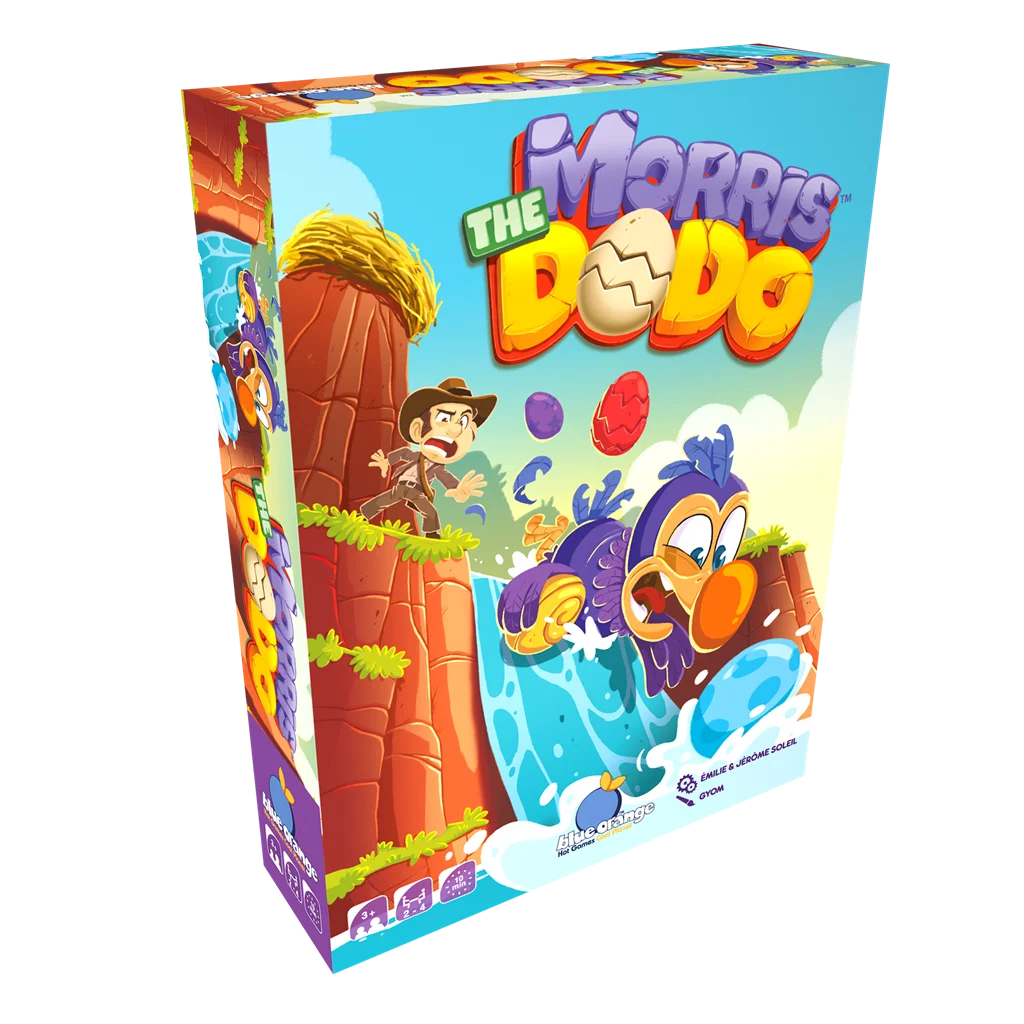 1 Dodo de madera, 1 Explorador de madera, 1 Cascada inclinada, 10 Fichas de escondites, 28 Fichas de huevo (7 huevos azules, 7 huevos morados, 7 huevos rojos, 7 huevos amarillos) y 1 Tablero