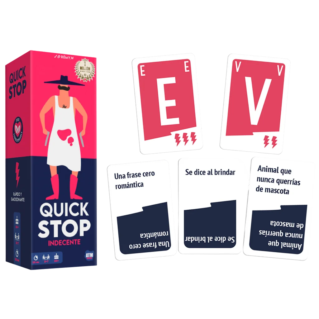 Quick Stop Indecente es un juego de cartas rápido, divertido e impredecible para mayores de 16 años. Los jugadores deben deshacerse de sus letras respondiendo palabras relacionadas con categorías más rebeldes que en el clásico Quick Stop.