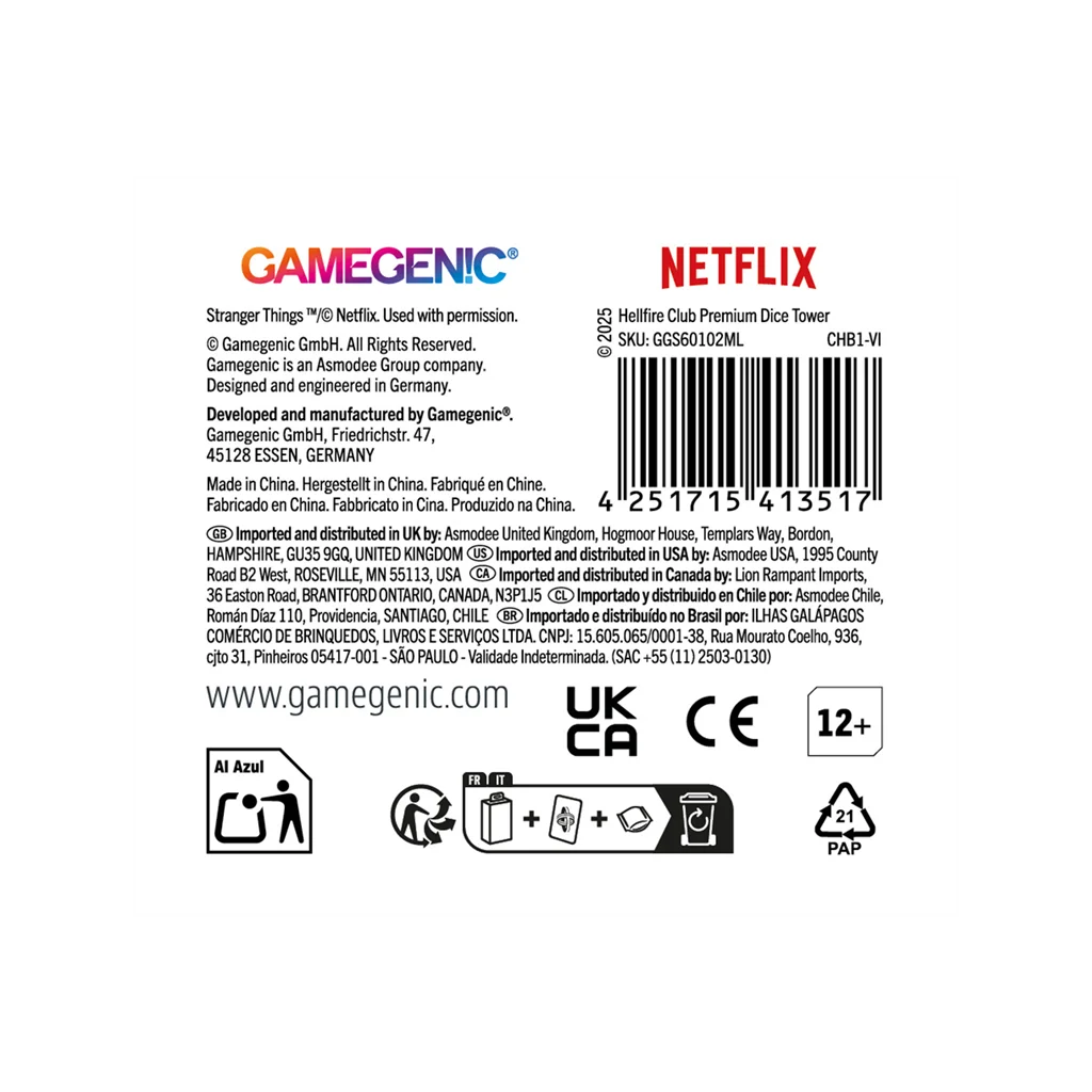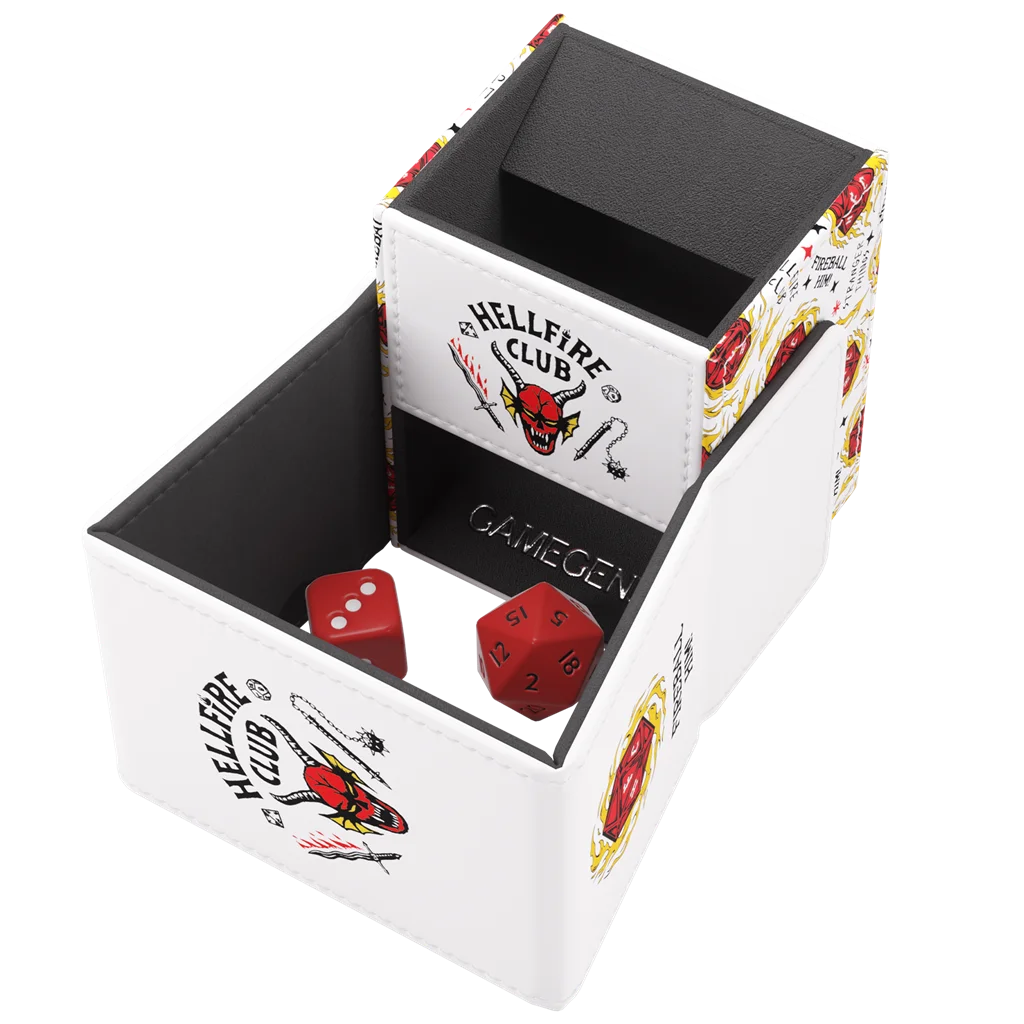 La torre para dados de gran calidad oficial Hellfire Club Dice Tower es un accesorio imprescindible para cualquier fan de la serie Stranger Things™. Está hecha con materiales de gran calidad e impresa por todos los lados con diseños emblemáticos del club del Fuego Infernal que la convertirán en el centro de atención de cada noche de juego.