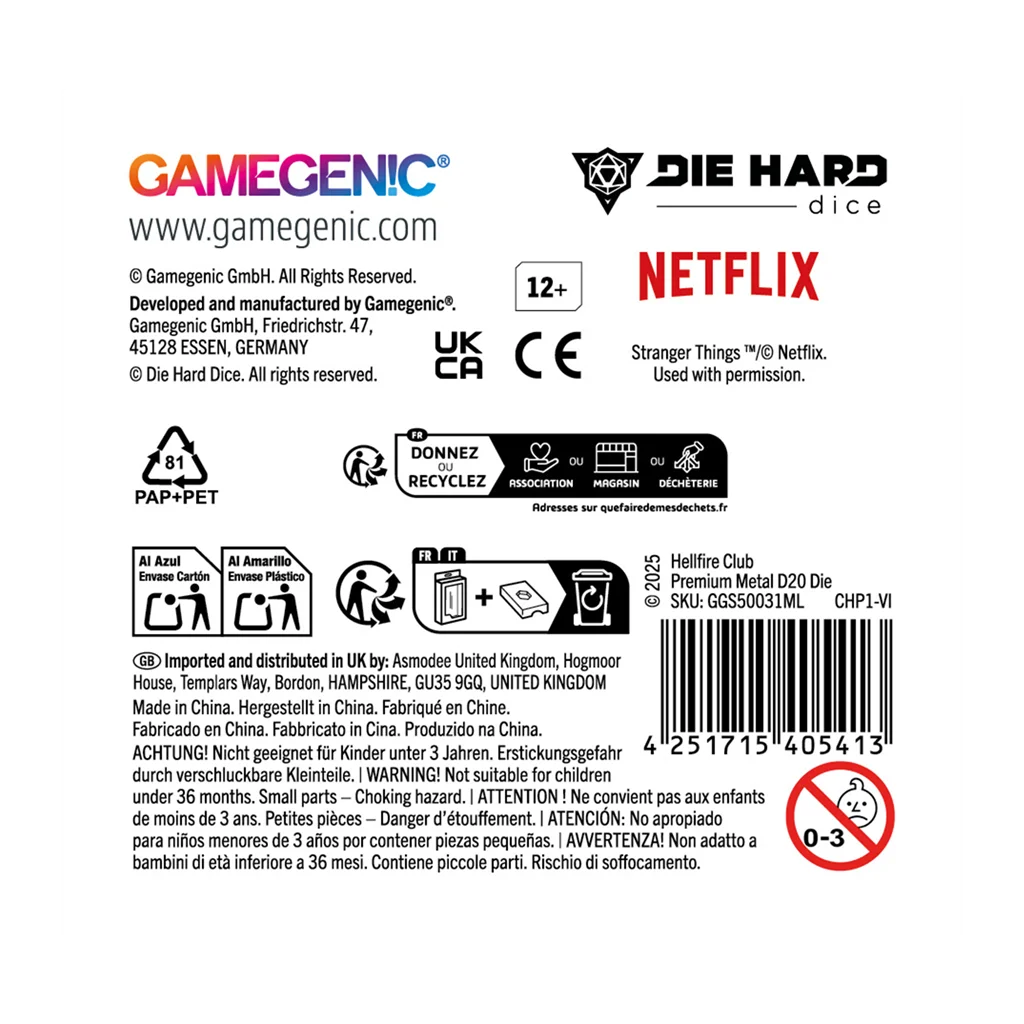 Gamegenic, en colaboración con Die Hard Dice, presenta este accesorio imprescindible para cualquier fan de la serie Stranger Things™. 10 de las caras de este dado único muestran 2 escenas repujadas exquisitamente del Mundo del revés, la dimensión alternativa misteriosa de la serie. Además, la cara 1 muestra la puerta entre las 2 dimensiones mientras que la cara 20 muestra al demonio del club del Fuego Infernal. Lo números están grabados en color rojo oscuro translúcido. Tanto los números como las escenas grabadas en los dados encajan perfectamente con la atmósfera única de Stranger Things™.