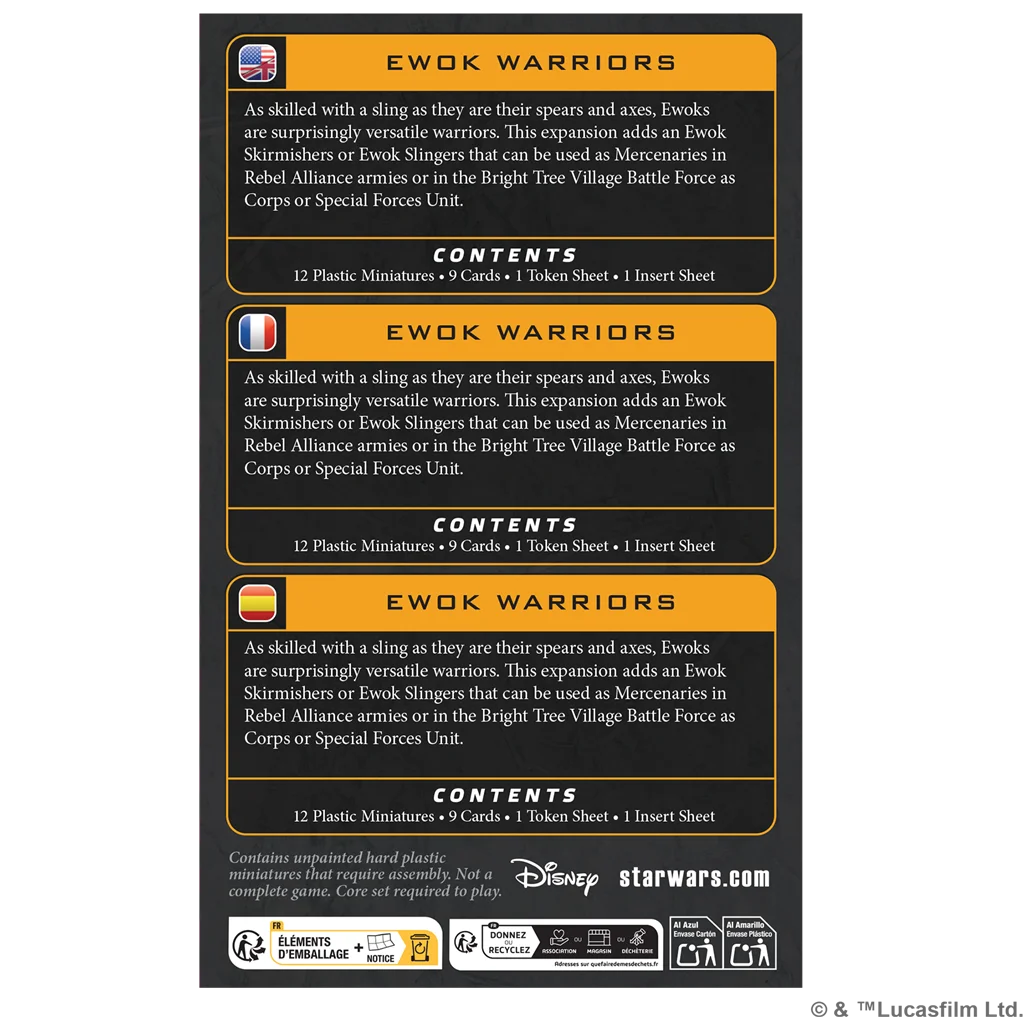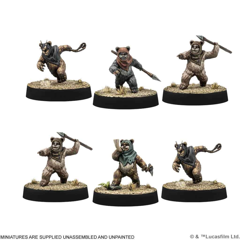 Los ewoks son guerreros sorprendentemente versátiles, tan hábiles con una honda como con sus lanzas y hachas. Esta expansión contiene miniaturas de Hostigadores ewoks y Honderos ewoks que pueden utilizarse como unidad Mercenaria en un ejército de la Alianza Rebelde, o bien en un grupo de batalla de la Aldea del Árbol Brillante como unidad de Tropa o Fuerzas especiales.