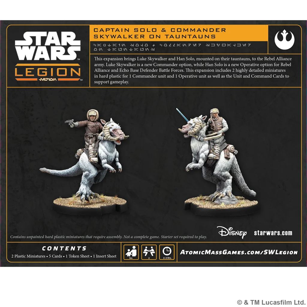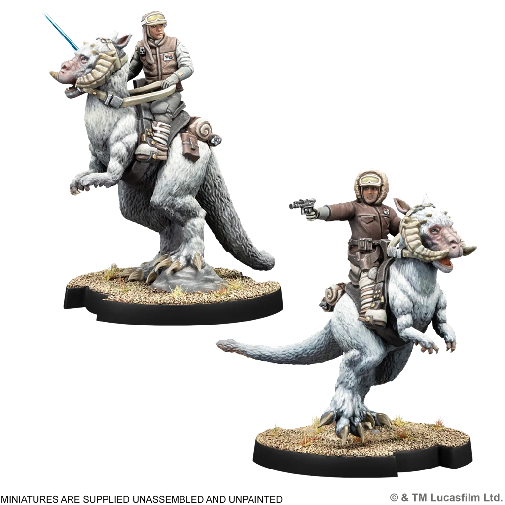 ¡Incorpora a Luke Skywalker y Han Solo como jinetes de tauntaun al ejército de la Alianza Rebelde! Luke Skywalker es un Comandante nuevo, mientras que Han Solo supone una opción adicional como Agente para grupos de batalla de la Alianza Rebelde y los Defensores de la base Eco. Esta expansión contiene 2 miniaturas esculpidas con todo lujo de detalle con las que pueden desplegarse 1 unidad de Comandante y 1 unidad de Agente, así como las cartas de Unidad y Mando necesarias para utilizarlas en tus partidas.