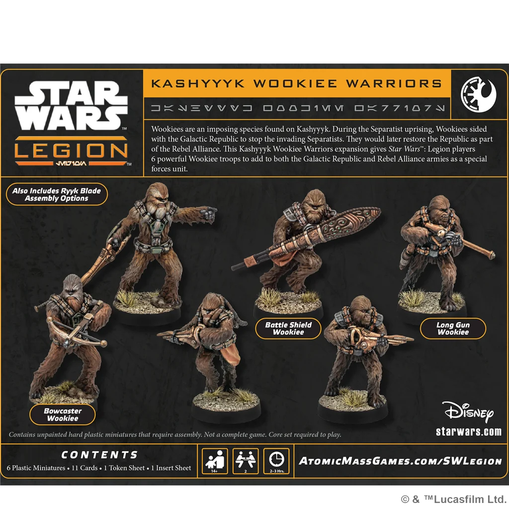 Los wookiees son una especie formidable oriunda del planeta Kashyyyk. Durante la sublevación separatista, los wookiees se aliaron con la República Galáctica para frenar la invasión de la Alianza Separatista, y posteriormente contribuyeron a la restauración de la República como parte de la Alianza Rebelde. Esta expansión para Star Wars™: Legión contiene 6 miniaturas de Guerreros wookiees con las que puede formarse una unidad de Fuerzas especiales para ejércitos de la República Galáctica y la Alianza Rebelde.