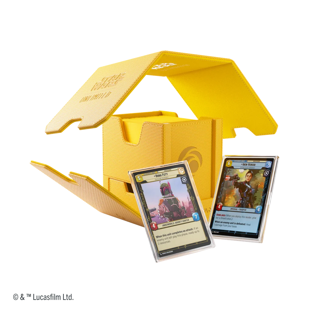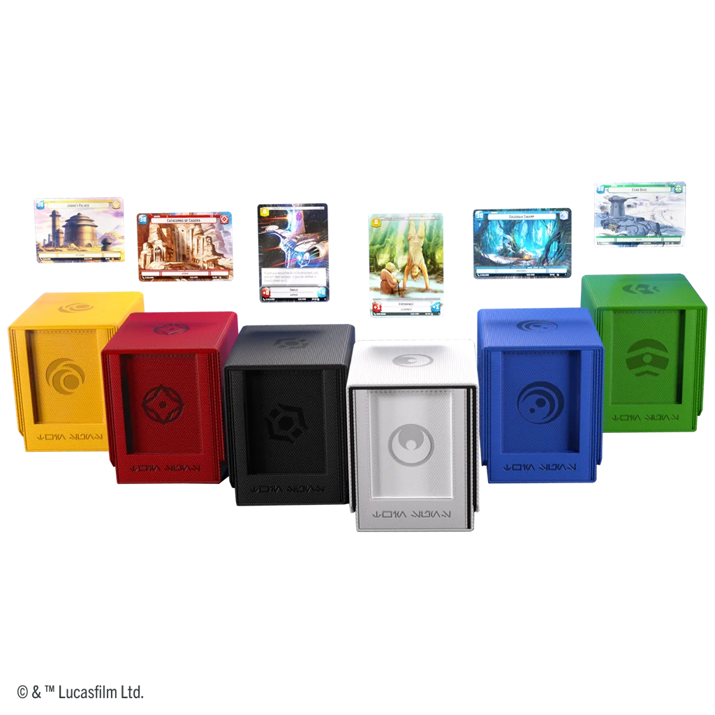 La novedosa caja TWIN SUNS Deck Pod de gran calidad y licencia oficial está diseñada específicamente para el popular formato TWIN SUNS Star Wars™: Unlimited. TIENE UNA CARACTERÍSTICA ÚNICA: esta caja incluye 2 fundas Slide Card Cases con protección UV adicional para que las 2 cartas de líder estén a salvo. Gracias a la colocación de estas cartas, el mazo se podrá identificar sin abrir la caja. Las 2 fundas Slide Card Cases se pueden extraer durante las partidas.