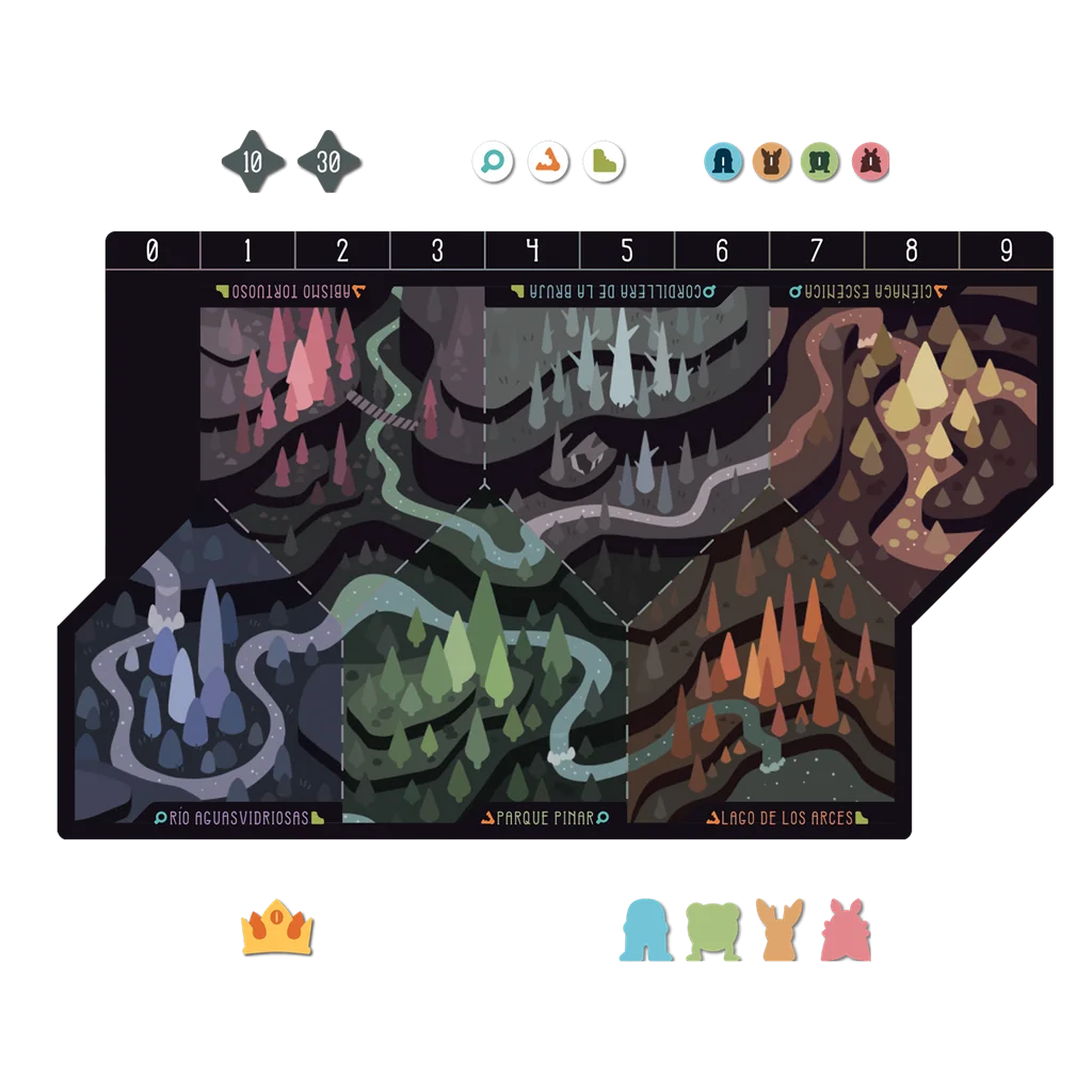 52 cartas de Acción, 12 cartas de Evento, 10 cartas de Rasgo Oculto, 4 cartas de Críptido, 36 cartas de Avistamiento, 12 fichas de Escondite, 4 figuras de Críptido, 30 fichas de Humano, 1 ficha de Participante Inicial, 1 tablero de La Naturaleza, 12 fichas de Mito de doble cara, 1 ficha de Socavón, 1 reglamento