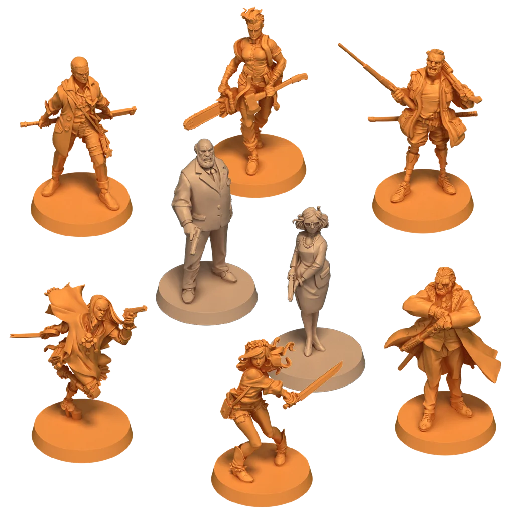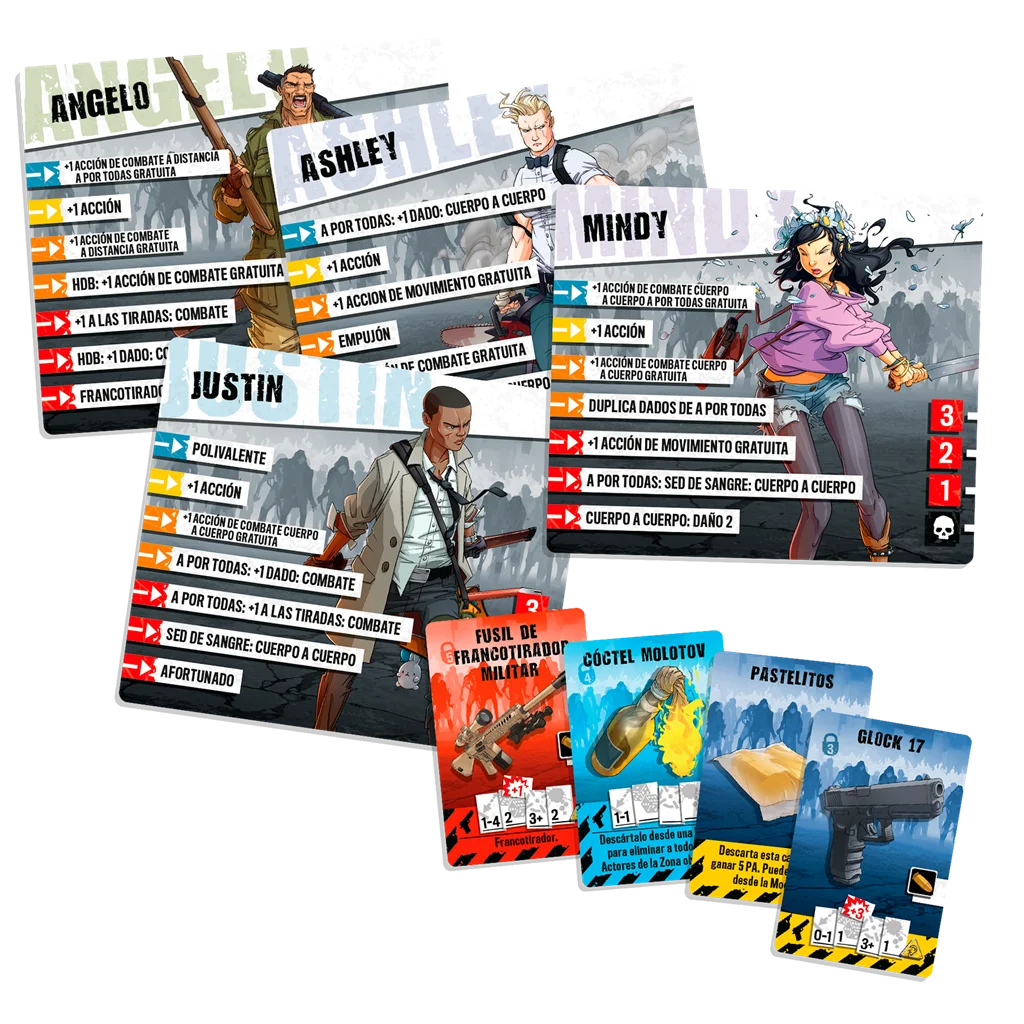 8 miniaturas - 6 Supervivientes - 2 Acompañantes, 6 tarjetas de Superviviente, 95 cartas de Equipo, 95 cartas de Objetivo, 6 módulos de tablero de doble cara, 6 dados de A por todas, 8 fichas, 1 cuaderno de reglas, 1 bloc de hojas de campaña